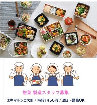 仕事内容 エキマルシェ大阪/ お弁当・惣菜 製造スタッフ募集 時給1450円 週3日から勤務可能 <ブランドについて> 今日のごはん何にしよう? その答えは十人十色。その日の気分でも違ってくることでしょう。 メニューを見て、実際に手に取って気がつく、そんなこともあるはず。 “和”をベースとしたお惣菜がそろった新感覚のDELI。 旬のおいしさ、見て楽しい彩りで仕上げたお惣菜を あれこれ手に取って選べます。 ここに来て、今日の“これ食べたい!”をみつけてみませんか。 <主な業務内容> ◇食材カット・調理 ◇パック詰め ◇食材管理 ◇売場清掃 など <服装> 黒パンツのみ、ご自身でご用意ください。 コックシューズは自費にて購入して頂きます。(2000円) その他は貸与 ※フリーター歓迎