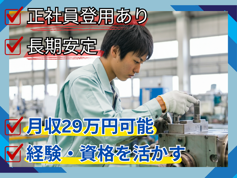 仕事内容 ◤ ̄ ̄ ̄ ̄ ̄ ̄ ̄ ̄ ̄ ̄ ̄ ̄ ̄ ̄ ̄ ̄ ̄ >>長期安定の正社員が目指せる<< スキルや資格を活かしたい方 さらなる技術を磨きたい方大歓迎! _________________◢ \\20代~40代の男性活躍中// 工場で稼働している機械の点検・メンテナンス業務です。 長期的な安定を目指したい方、機械に興味がある方大歓迎! <メンテナンス業務> □点検・メンテナンス 工場内で稼働している機械の状態を定期的に確認し、不具合がないかをチェックします。 □部品の交換作業 消耗部品の交換や修理対応を行います。 □トラブル発生時の対応 機械が予期せず停止するなど設備トラブルが発生した際には、迅速に原因を確認し復旧対応を行います。 状況に応じて柔軟な対応が求められます。 <事務業務> ◇計画表の作成 あらかじめ決められた年間スケジュールに基づき、メンテナンスや事前準備の計画表を作成します。 ◇データ入力 難しい内容ではないので、PC基本操作ができれば問題ありません。 丁寧な指導・サポート体制で、未経験の方でも段階的に仕事を覚えられる環境です。 機械に触るのが好きで「挑戦してみたい」という意欲があれば大歓迎です! 普段から機械いじりをしている方や、仕事でメンテナンス経験がある方であればスムーズに業務に取り組めます。 スキルや経験を活かし、正社員を目指しながら工場の安定稼働を支えませんか? まずは、お気軽にお問い合わせください!