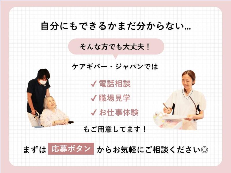 仕事内容 メディカルホームにて、 居室での看護業務をお任せします。 ご入居者さまの健康管理や医療処置、 終末期ケア(ターミナルケア)を行う 看護師のお仕事です。 ✨求人のポイント✨ ・2026年8月オープン予定の新施設 ・月給47万円以上の高水準給与 ・終末期の専門性や総合スキルが身につく ・昇格のスピードが速い/ 20代の看護師長も活躍中 ・平均残業月8.5時間/持ち帰り仕事なし ||◤ケアギバージャパンで働く魅力 ✅終末期の知識や総合的なスキルが 身につく! 内科だけでなく、外科や救急など 様々な科出身の看護師が在籍。 専門分野が違うスタッフと密に連携を 行うため、今までの経験で培った強みを 活かしつつ、自分になかった新しい知識 を吸収できる環境です。 ✅昇格のスピードが早く、チャンスが 豊富! 年齢や経験年数にとらわれず、 あなたの「意欲」と「実力」を正当に 評価します。 20代の看護師長も活躍しており、 若くして責任あるポスト(年収600万~ 800万円)を目指すことが可能です。 実際に入社1年で主任へ昇格し、 前職の病院勤務5年目以上の給与水準を 実現した事例も! 現在、新規出店を積極的に進めており、 様々な看護師長(10人規模のマネジメント など)のポストが生まれています。 現場以外の新しいポストや環境への挑戦も 歓迎しており、施設内での異動(社内転職) の選択肢もあります。 ✅独自のポイント制度で、頑張りは賞与 で還元! 当社には独自の評価ポイント制度が あります。 日々の頑張りや成果が可視化され、 それがダイレクトに賞与(ボーナス) に反映されます。 「やりがい」と「高い給与」 の両方を実現できる環境で、 モチベーション高く働けます。 ||◤病院経験者が驚く、 「忙しいけど、働きやすい」の正体。 「訪問看護」といっても、 車で移動するのではなく、 施設内の個室を順に回るスタイルです。 ミスマッチを防ぐため、 業務のリアルを包み隠さずお伝えします。 ⏩仕事のイメージ 1日約13室を訪問します。 スケジュールは決まっており、 移動とケアを繰り返すため体力は必要です。 感覚としては「療養病棟」での勤務に近い かもしれません。 決して「楽な仕事」ではありませんが、 臨床経験がある方なら、 すぐに慣れていただけるリズムです。 ⏩当社の給与水準が高い理由 それは 「勤務時間内は、密度濃く働くから」 です。 残業ほぼなし: 緊急対応の仕組みや記録の効率化により、 定時退社が基本です。 持ち帰り仕事ゼロ: 委員会活動や勉強会の資料作りで、 家に仕事を持ち込むことはありません。 納得の評価: その日の頑張り(訪問件数や対応)が、 独自のポイント制度で賞与に直結します。 「忙しいのは苦ではないが、サービス残業 や終わりのない業務はもう嫌だ」 「仕事はきっちりプロとしてこなし、 給与もしっかり貰う。 その代わり、定時後は自分の時間を 全力で楽しむ」 そんな、メリハリのある働き方を求めている 方には、これ以上ない環境をお約束します。 ||◤株式会社ケアギバージャパンとは? 当社は2010年5月に設立し、 「寄り添って、いつでも、どこでも、 誰にでも」 を理念に、入居・通所・在宅などの 介護サービスを提供しています。 利用者様への快適なサービス提供とともに、 従業員が私生活と両立しながら 長くやりがいを持って働けるよう、 評価制度や福利厚生を整えています。 職場見学も受付中です♪ まずはお気軽にお問い合わせください。 【✨具体的な仕事内容✨】 施設居室での看護業務をお任せします。 ▼主な業務 ・バイタルチェック、経過観察 ・服薬管理などの健康管理 ・喀痰吸引、経管栄養(経鼻含む)、 点滴管理 ・人工呼吸器の管理 ・医師・ヘルパーとの情報連携 ・タブレットでの看護記録作成 など 終末期の緩和ケアを中心に、 入居者様一人ひとりに寄り添った 看護ができる環境です。 ::.。.: .。.: .。.: .。.::.。.: .。.: .。.: .。.::.。.: 【✨とある1日の流れ✨】 *看護夜勤ライン* 個別30分ケア + フリーラウンド 17:00 申し送り確認 17:30 カートセッティング 18:00 個別ケア 22:00 記録・フリーラウンド 24:00 休憩 翌01:00 フリーラウンド 05:00 個別ケア 08:30 記録・申し送り 09:00 業務終了 【✨頑張りが収入に反映される評価制度✨】 毎月の評価に応じてポイントを付与。 1ポイント=1円として、 年3回の賞与支給時にまとめて支給します。 研修参加・資格取得・検定クイズへの参加 でもポイント獲得が可能です。 獲得ポイントやインセンティブは スマホのマイページでいつでも確認でき、 次回賞与の目安もチェックできます◎