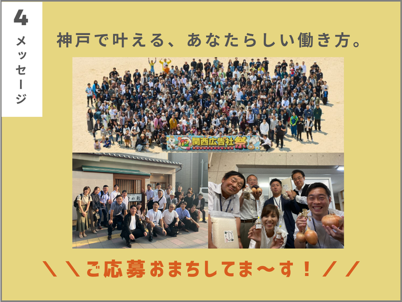 【保険制度】 雇用保険、労災保険、健康保険、厚生年金 待遇・福利厚生 【福利厚生】 ・各種社会保険完備 ・賞与は年3回!(4月・8月・12月) ・各種報奨金/インセンティブあり ・奨学金返済支援制度あり(規定による) ・社用車貸与(通勤もOK)・社用携帯・タブレット貸与 ・営業に必要なツールはすべて会社が用意します! ・研修旅行あり(国内・海外) ・充実の教育・研修制度でスキルアップもサポート ・個人や営業所ごとの表彰制度あり ・直行直帰OK! ・ベネフィット・ステーション導入 Netflixや飲食店、映画館、ホテル、スポーツジムなど、 会員限定の優待価格で利用できます ・健康経営優良法人2025 認定企業! ■ちょっと変わった⁉面白すぎる福利厚生 ┈┈┈┈┈┈┈┈┈┈┈┈┈┈┈┈•• 「そんな制度あるの!?」 と社員も驚くような、 ちょっとユニークで、 ちょっと嬉しい制度がいっぱい✨ ✨お子さんや家族も一緒に楽しめるイベント! 当社では、従業員だけでなく、 その家族も大切にしています。 春には「関西広告社祭」、 秋には「収穫祭」といったイベントを開催! 子どもも大人もワクワクできる 景品が盛りだくさんの大抽選会や、 家族で楽しめる催しで、 日頃の感謝を伝え合う場となっています。 ✨毎月1~3kgのお米を配布! 自社で育てたこだわりの 無農薬・天日干し「幸穀米」を 毎月全社員にプレゼント! ✨季節のお楽しみ便も! 無農薬野菜や旬の果物など、 季節のお楽しみ便も毎月届き、 社員から大好評! ✨誕生日はちょっと特別な1日に 毎月、誕生日月の社員で食事会&観劇を開催。 みんなで「おめでとう」を伝え合う 温かい文化があります。 ✨好きな本の購入を会社が支援! ジャンルは自由。 ビジネス書からレシピ本、雑誌、絵本まで◎ ✨健康管理をゲーム感覚で楽しく! BMIが標準値なら…なんと賞金支給! BMIが標準値なら賞金も♪ 健康ダイアリー制度で無理なく健康意識アップ。