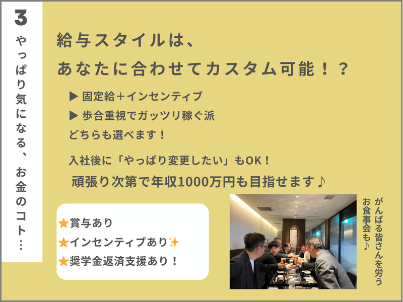 月給300,000円以上 給与詳細 ※基本給・固定残業代の総額 基本給:月給 25万8500円 〜 固定残業代:あり 1ヶ月あたり4万1500円 〜(固定残業時間:1ヶ月あたり22時間) 固定残業時間を超えた勤務時間については別途残業代を支給する 【一律手当】 全員に一律で支払われる通勤・皆勤・家族手当金額:なし 全員に一律で支払われるその他手当金額:なし ・賞与(年3回:4月、8月、12月) ・一律外出手当 ・各種報奨金(規定)(インセンティブあり) ・歩合制の勤務も選択可 ・年収1000万円も可能! (一律手当のうちのその他手当) 試用期間中は歩合給の先渡しで 一律75,000円を支給しております。 ⭐固定残業が22時間分ついておりますが、 当社の残業はほぼなし!✨ 毎日18時には「おつかれさま~!」と 退勤するのが当社の“あたりまえ”です♪ ⭐がんばりをしっかり還元する 【各種報奨金】&【インセンティブ】あり! 【給与例】 給与例 <入社3年目20代男性> 月収34万円+賞与(年3回) =年収500万円 <入社4年目20代男性> 月収48万円+賞与(年3回) =年収600万円 <入社10年目30代女性> 月収70万円+賞与(年3回) =年収1000万円 <入社5年目40代男性> 月収90万円+賞与(年3回) =年収1300万円