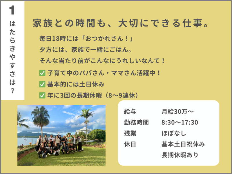 休日休暇 ◎週休2日制、日・祝+隔週土曜休み! └ 月2回ほど土曜日の出勤がありますが、 予定は事前にしっかり調整◎ ◎年3回の大型連休あり!(各8~9連休) └ GW・夏季・年末年始は 長~いお休みでリフレッシュできます! 今年のお盆は【8月9日~17日】の9連休✨ ◎産前産後休暇、育児休暇も完備! ◎有給休暇やインセンティブ休暇も充実◎ ■スタッフの声 ┈┈┈┈┈┈┈┈┈┈┈┈┈┈┈┈•• 長期休暇は家族や友人と過ごしたり、 趣味に没頭したり。 休みがしっかりあるから、仕事も頑張れます! こんな風に、 プライベートも大切にできる環境が自慢です♪