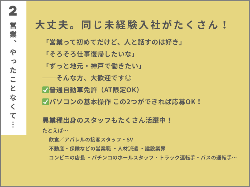 求めている人材 \20代・30代・40代活躍中!/ ・第二新卒やブランクのある方 ・フリーターからの正社員デビュー ・子育てと両立したい方も大歓迎です! ■応募条件 ┈┈┈┈┈┈┈┈┈┈┈┈┈┈┈┈•• 【必須】 ◎普通自動車運転免許(AT限定可) ◎基本的なPC操作ができる方(入力・メール対応程度でOK) 【こんな方は特に歓迎!】 □ 未経験から営業にチャレンジしたい方 □ 自分のペースでのびのび働きたい方 □ 地元で長く働ける仕事を探している方 □ 接客・販売など人と関わるお仕事の経験がある方 □ 営業経験や広告業界の経験を活かして活躍したい方 ■異業種出身のスタッフも多数! ┈┈┈┈┈┈┈┈┈┈┈┈┈┈┈┈•• たとえば… ・飲食/アパレルの接客スタッフ・SV ・不動産・保険などの営業職 ・人材派遣 ・建設業界 ・コンビニの店長 ・パチンコのホールスタッフ ・トラック運転手・バスの運転手 ・自動車ディーラーの営業 ・製造・金融・事務 … と本当に様々な業界・職種の方が大活躍! 「稼ぎたい」「家庭と両立したい」 「土日休みがいい」 「女性が働きやすい職場で働きたい」… 応募理由はなんでもOKです◎ あなたらしいスタートを、 ここから始めてみませんか?