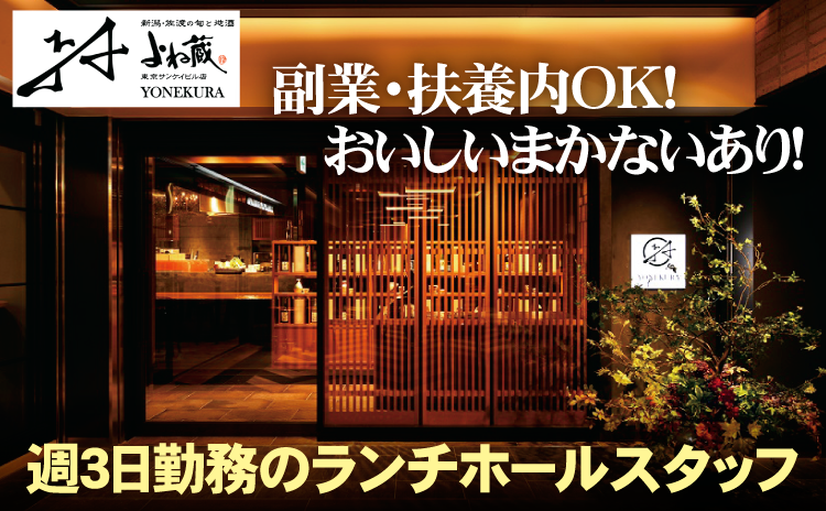 仕事内容 【 お仕事のポイント 】 ・未経験者も働きやすい ・扶養内勤務OK ・ランチのみの短時間 ・土曜+平日2日の週3日勤務 ・大手町駅から徒歩1分の立地 ・副業・Wワークにもピッタリ ・業績安定のよね蔵グループ 【 仕事内容 】 よね蔵 東京サンケイビル店でランチタイムのホールスタッフ(アルバイト)を募集しています。 飲食店未経験の方も歓迎!笑顔で接客できる方をお待ちしています。 おまかせするのは、 ・お客様の対応:席への案内、注文、お会計(レジ) ・配膳:料理や飲み物の提供 ・清掃と準備:テーブルやカウンターの掃除、おしぼりや箸、グラスなどの補充、食器やグラスの片付けと洗浄 等 勤務はランチのみの短時間で、土曜を含む週3日勤務のため扶養内で働きたい方にもぴったりです。家事やプライベートとの両立がしやすく、無理なく続けられるお仕事です。15時までの勤務だから、夕方以降の時間をゆったり使いたい方にもおすすめです。飲食業が初めての方でも、丁寧なサポートがあるので安心してスタートできます。短時間勤務だから自由度も高く、Wワークや副業を希望される方にも最適。主婦パートの方や、日中の空いた時間を有効活用したい方に働きやすい職場環境です。 美味しいまかないで、働きながらお腹も満たせるのが嬉しいポイント!さらに、お誕生日にはお店から“お食事券”のプレゼントもスタッフ想いのこうしたちょっとしたご褒美が、日々のモチベーションにつながります。 【 活かせる資格・経験 】 ・飲食店での接客・ホール経験 ・小売販売、コンビニ、ホテル、レストラン等のサービス業 飲食経験があればもちろん、居酒屋・和食・中華・焼肉・ラーメン・ファミレス、どんなジャンルの経験でも活かせます。未経験の方やはじめてのアルバイト、ブランクがあって不安に感じている方も、しっかりとした研修と充実のサポートで安心してはじめることができますよ。 【 YONEKURAグループについて 】 よね蔵グループは1989年の創業以来、新潟の食材や地酒などの食文化を大切に、時代とともに変化するニーズに寄り添い続け、地域に根ざした飲食事業を展開しています。雇用面では、約830名の従業員を支えており、単身者向け社宅も完備し、UIJターンや地方移住を希望する方にも柔軟に対応しています。 正社員登用制度がございますので、アルバイト・パートをお探しの方はもちろん、正社員へのキャリアアップを目指すフリーターや、調理師や栄養士、ホテル、ブライダル業界を目指して大学や専門学校に通われている学生さんにとっても貴重な体験や選択肢の機会ができますよ。ハローワークで求職中の方や第二新卒、派遣、契約社員、Wワーク、短時間や短期アルバイト、主婦パートなどで在職・勤務中の方からのご応募も歓迎いたします。 詳細や聞いてみたいことなどがありましたらお軽にご連絡ください。電話でのご応募も可能です。 TEL. 0256-64-7432(採用担当まで)