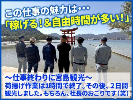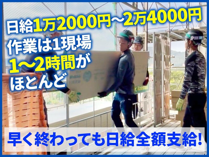 仕事内容 岡山市・倉敷市エリアを中心に、 新築住宅現場で内装資材 (石膏ボードなど)を運搬します。 1現場だいたい2~4名で 余裕をもって作業しています。 最初は先輩スタッフと2人1組で 資材の持ち方などを覚えていきましょう。 だいたい1か月ほどでコツがつかめますよ♪ 現場へは、最初は先輩と乗り合わせて、 慣れると現場への直行直帰OK! ==================== ☆この仕事のポイント☆ ✅短時間で稼げる! ・2現場…1万2000円~ 3現場…1万8000円~ 4現場…2万4000円! ※1現場あたり6000円~ ・1現場は4時間以内の作業ですが、 1~2時間で終わることが多数。 時給に換算すると3000円以上! (ここだけの話、5分で終わる現場も あります…。もちろん、給与は全額支給!) ・能力に応じて、随時昇給あり。 ・月収例(入社10か月スタッフ): 月収34万5000円(1現場7500円、1日平均2現場、23日勤務の場合) ✅自分時間がたっぷり♪ <例:新人スタッフ1日の流れ(2現場の日)> ・7:00 集合・移動 おはようございます! まずは事務所に集合して、 先輩と一緒に車で現場へGO! 移動中は軽く雑談したり、 仕事のコツを教えてもらったり。 ※集合場所は、現場によって「自宅近く」など 事務所以外の場合もあり ・8:00 現場到着&作業スタート! 現場に着いたら、 ヘルメットを装着して作業開始! 資材をどんどん運んでいきます。 みんなで声を掛け合いながら、 チームワークでサクサク進めます! ・10:00 1件目、現場終了! 「おつかれさまでしたー!」と1件目の 作業が終了!ひとまずホッとひと息。 ・10:00~12:00 ちょっと休憩&次の現場へ 車で移動しながらコンビニ寄ったり、 スマホゲームしたり。 このゆるい時間が、実はけっこう楽しい♪ ・12:00 2現場目に到着!再び作業スタート! 午後も元気に作業スタート! 体が慣れてくると、午前よりスムーズに 動けるようになりますよ! ・14:00 2現場目、終了! 2件目の作業も無事に完了! 今日の仕事はこれでおしまい! ・14:00~15:00 事務所に寄ってから退勤! あとは自由時間♪ おつかれさまでした〜! このあとは家に帰ってYouTube見たり、 お昼寝したり、趣味の時間を満喫。 午後を丸ごと自由に使えるって最高! ※慣れたら現場へ直行直帰OK ※これだけ時間に余裕があるので、 「もっと稼ぎたい!」という方は 1日に3~4現場回って 月収40~60万円も可能!! ✅達成感がある ・重い資材をすべて運び終わった後は、 「やり切った!」という達成感が気持ちいい! ・大工さんや現場のお客様から 「ありがとう」と感謝される瞬間が嬉しい! ==================== <社長から一言> どうせ働くなら、しっかり稼ぎながら 体を動かして健康的になれる仕事をしませんか? この仕事は全身を使って資材を運ぶから、 働くうちに自然と体が鍛えられます。 実際、 「体が引き締まった!」 「前よりも体力がついた!」 というスタッフも多数。 稼げる・鍛えられる・成長できる。 その全部を手に入れて、 先輩たちのように 誇れる荷揚げのプロを目指してください!