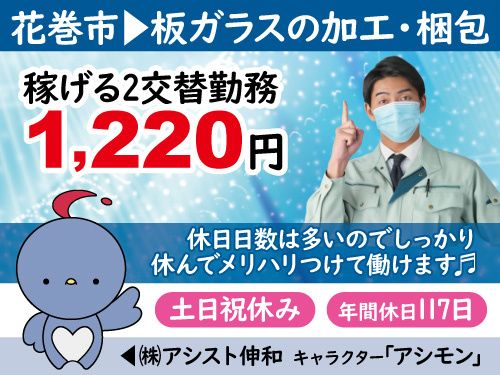 仕事内容 岩手県花巻市にある工場にて、 板ガラスの加工及び梱包作業をおこなっていただきます。 機械操作でのカット作業となります。 【オススメポイント】 ・2交替でしっかり稼げる! ・基本的に土日祝休みなので安心! ・特別に必要な資格や経験はありません! ・モクモク作業なので業界未経験者もOKです! 「具体的なお仕事内容」 〇板状ガラスのカット作業 専用の機械を使って、板状のガラスを 必要なサイズにカットします。手順通りに 作業を進めれば、力仕事はなく、 機械の操作に集中できる作業です。 〇カット後のガラスのチェック カットしたガラスにひび割れや不良が ないかを確認します。目視で簡単に チェックできるので、細かいところに 気を配ることが得意な方に向いています。 〇梱包作業 カットしたガラスを保護するために、 丁寧に梱包します。ガラスが傷つかない ように専用の緩衝材やパッドを使い、 箱に入れて出荷準備をします。 〇機械操作の管理 ガラスカットの機械に設定を行い、 作業がスムーズに進むよう管理します。 機械の調整や操作は、最初は先輩が サポートしてくれるので安心です。 〇安全管理と清掃作業 作業中の安全確認を行い作業後には 機械や作業場を掃除します。 清潔な環境での作業が推奨されており、 集中して作業に取り組める環境です。 「未経験からスタートできる!」 特別に必要な資格や経験はありません。 現在活躍中のスタッフも初めは未経験スタート! 先輩スタッフが丁寧にサポートしますので 安心してお仕事できます。 最初はカンタンな作業からお任せします。 「働きやすさ」で選ぶなら 「アシスト伸和」にお任せください! 他にも多数お仕事がございますので、 あなたに合ったお仕事探しが可能です。 ぜひ一度お気軽にご連絡ください!