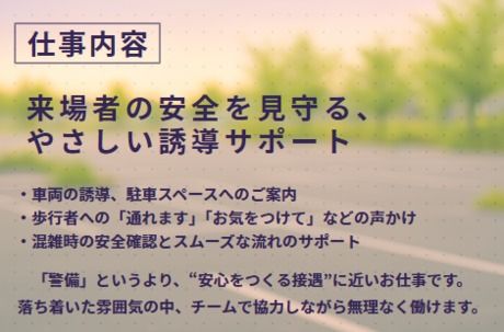 仕事内容 ★午前だけ勤務で午後は自由に! 「動いて稼ぐ」「時間を有効活用」そんな働き方、はじめませんか? 【おすすめポイント】 ☆ 土日祝・大型連休限定 ☆ 実働5時間で日給10,000円超(時給換算2,100円) ☆ 入社祝い金 最大10万円支給 ☆ Wワーク・学生・主婦(夫)歓迎 ☆ 交通費全額支給・送迎手当あり・車通勤OK ☆ チーム制&研修ありで未経験も安心 ☆ 予定に合わせて働ける!事前申請制 ☆ 月数回だけの勤務もOK ☆ 「週末だけ」も「週5で安定収入」もOK!(平日他現場も多数あり)あなたの働き方、選べます◎ 【仕事内容】 高速道路サービスエリア内の駐車場にて、来場者の安全とスムーズな通行をサポートする交通誘導のお仕事です。 <おもな業務内容> ・車両の誘導、駐車スペースへのご案内 ・歩行者への「通れます」「お気をつけて」などの声かけ対応 ・混雑時の安全確認とスムーズな流れのサポート 警備未経験の方でも安心してスタートできるよう、 チーム制&丁寧な研修をご用意しています。 「警備」というより“安心をつくる接遇”の感覚に近く、 落ち着いて働きたい方にぴったりのお仕事です。 【勤務スタイル】 ・勤務時間:6:00~12:00(休憩1時間/実働5時間) ・出勤日:土日祝・大型連休中心 ・勤務は事前申請制(予定に合わせて調整OK) ・午後は自由時間!授業・家事・趣味との両立に最適 【スタッフの声】 ◎ 学生/20代男性 授業が午後からの日は、朝だけサッと働けるこの仕事がちょうどいいんです。 最初は緊張しましたが、先輩が丁寧に教えてくれて安心しました。 「ありがとう」の声をかけてもらえると、ちょっと誇らしい気持ちになりますね。 ◎ 主婦/30代女性 家族が起きる前にサクッと勤務。お昼には帰れるので、家事や育児にもしっかり時間が使えます。 短時間でもしっかり稼げて、気分転換にもなるのがうれしいです。 ~ 職場環境 ~ リニューアルされた守谷SAは、清潔で自然豊かな職場。 柔軟なシフトで学業や副業との両立も可能です。 頼れる先輩がそばにいるチーム制だから未経験でも安心。 働きやすさとやりがい、どちらも叶います。