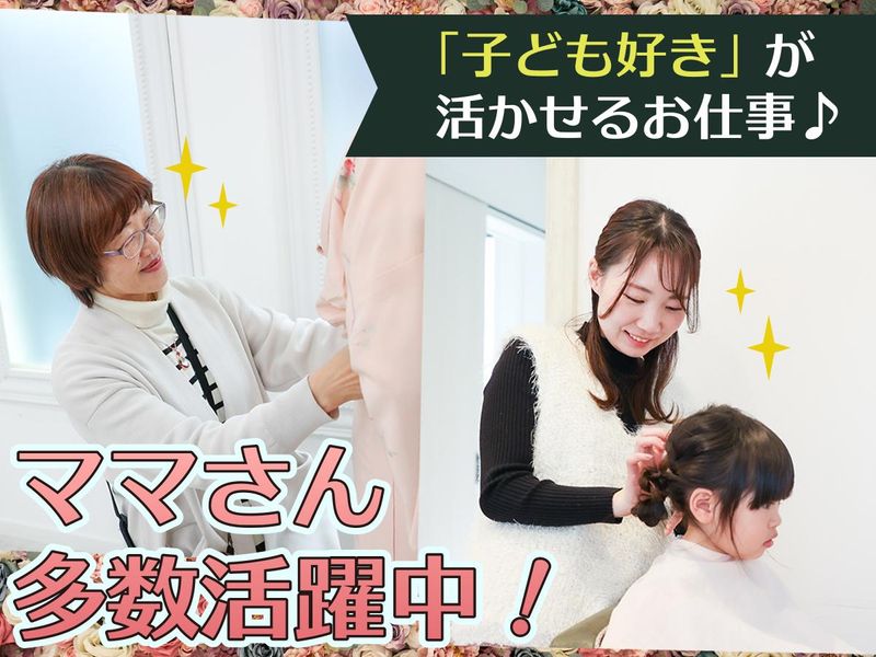 求めている人材 学歴不問 <必須> ヘアメイク、着付け どちらかできる方 <あれば尚可> フォトスタジオや写真館での勤務経験がある方 \✨こんな方を求めています!✨/ ✅子どもと遊ぶのが得意な方 ✅子どもと過ごす時間が大好きな方 ✅子育てが一段落して、大好きな子どもに関わる仕事がしたい方 【私たちのチームの魅力】 バラエティ豊かなプロフェッショナルが活躍中!あなたの経験も必ず活かせます。 ⭐ママさん多数活躍中! 店長をはじめ、子育てと仕事を両立しながら、長年のキャリアを活かして働くスタッフが多数在籍。 結婚・出産後に、復職したメンバーもいます。 「親御さんの気持ち」と「プロの技術」の両面から、ご家族の大切な一日を支えています。 ⭐美容師・大手スタジオ・ブライダル出身者が集結! 美容師としてのサロンワーク、ブライダル現場での迅速な対応力、フォトスタジオでのトレンド作りなど、多様なバックボーンを持つ技術者が揃っています。 「苦しくない着付け」や「崩れないヘアセット」など、確かな技術を惜しみなく共有し合える環境です。