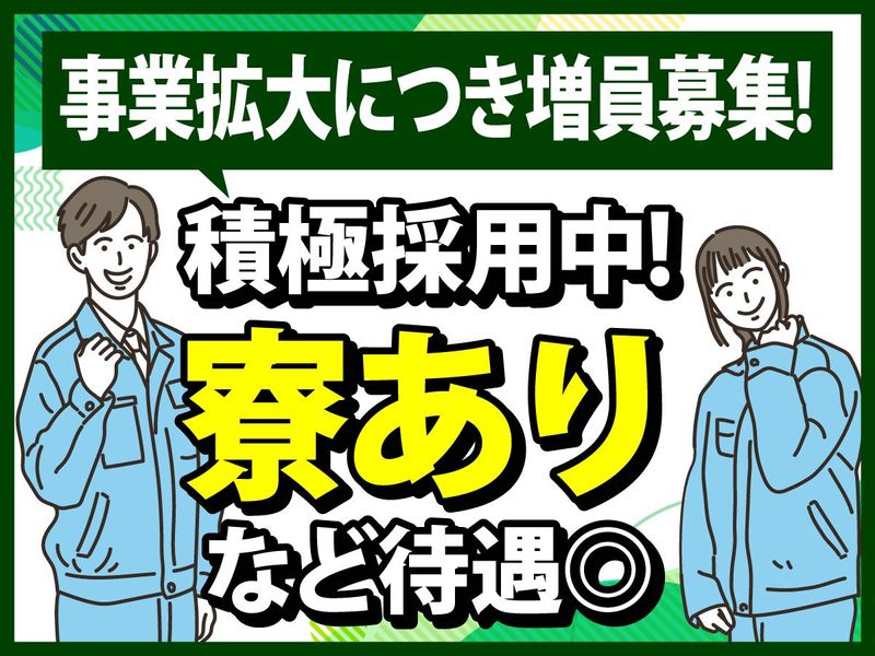 仕事内容 \設備メンテナンス・清掃スタッフ募集/ 建設現場などから搬出された 廃棄物リサイクル工場でのお仕事です◎ ✨人付き合いが苦手な方 コミュニケーションが苦手な方でも大丈夫! コツコツもくもく作業◎ ✨工場や設備を綺麗に保ち、 働きやすい環境を維持する大切な役割を担います! <主な業務> ◆プラント設備メンテナンス …設備の点検・管理(正常に稼働しているかの確認) ※資格・経験は不要です! ◆清掃作業 …機械の汚れ落としや、床に落ちた土などの清掃(ほうき・専用掃除機を使用) 資格や経験がなくても始められるシンプルなお仕事! 自分たちの作業で工場が清潔になり、 従業員が快適に働ける環境をつくるやりがいがあります◎ ✅未経験歓迎! 年明けの事業拡大に向けた増員募集のため 大量募集・積極採用中! 経験不問でしっかり稼げるお仕事です! ✅「寮あり」など他にも充実の好待遇あり! 入寮可!面接時にお気軽にお問い合わせください! 休憩スペースあり!冷蔵庫使用OK!電子レンジ使用OK! お弁当を食べながらゆっくり休憩ができますよ! 他にも個人ロッカーありで安心! ✅採用担当、現場担当より 働きやすい現場作りをしています! 時代の変化に合わせて、従業員の皆さまがより良い環境で働けるよう、日々新しいことに挑戦をしています。 働く上で不安なこともお気軽にご相談ください。 従業員の皆さんが「明日も行きたい現場」を一緒に作っていけたらと思っています。