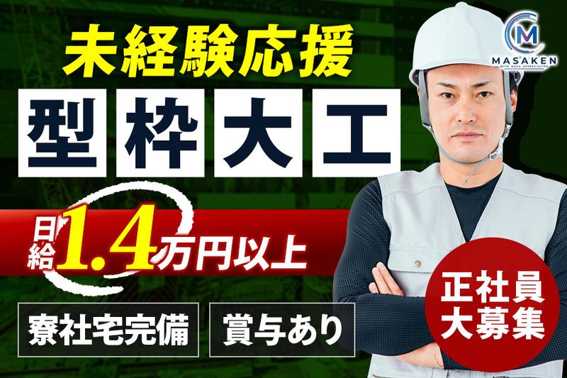 【アピールポイント】 \手に職つけて一人前の職人へ/ 型枠工事の大工見習いを正社員募集! ◆未経験OK ◆日給MAX2万円 ◆早期昇給あり ◆社員寮・家賃補助あり ◆週休2日制も可