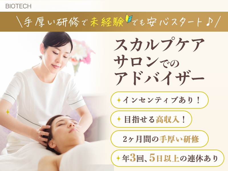 仕事内容 * お客様満足度97.2% * お客様の髪の悩みを解決する アドバイザーを募集します! <仕事内容> ・スカルプケアサービスのご提供 具体的には? ・ヒアリング(髪のお悩み・生活習慣など) ・頭皮・毛根のチェック ・施術(抜け毛防止のためのシャンプーや頭皮のケア) ・頭皮の現状を確認・プランをご提案 ノルマを意識する必要がないので、 悩みを抱えているお客様一人ひとりに寄り添った ご提案やアドバイスができます! \知識や経験がなくてもOK!/ ほとんどのスタッフが未経験スタート! 「人と接する仕事をしたい」気持ちがあれば、 専門知識と実技は入社後に身に付く環境です。 ▽入社後の流れ(教育研修制度) 入社後1〜2ヶ月 配属先のサロンで当社の理念や サロンスタッフに必要な心得を学び、 その後、発毛・育毛の基礎知識をはじめ、 髪の触り方、シャンプーの仕方、お客様との接し方など イチから丁寧に教えていきます。 入社後2ヶ月 『アドバイザー』認定試験を受けてもらいます。 試験に合格したら、プロとしてデビューです! その後 独り立ち後も3ヶ月に1回の研修や、 研修スタッフや店長、先輩が フォローしてくれるので安心です! ▽会社について バイオテックは特許取得した技術をもとに 日本と海外で育毛専門サービス業界の 事業展開をしています。 設立から40年以上にわたって、 大勢のお客様の髪に対するお悩みを解決してきました。 「お客様を二人三脚で支援する」という接客姿勢が評価され、 お客様満足度97.2%の実績を誇っています!