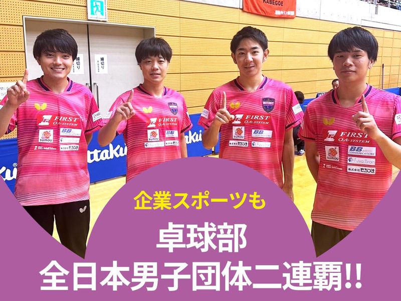 【保険制度】 雇用保険、労災保険、健康保険、厚生年金 待遇・福利厚生 【福利厚生】 ◆交通費支給(月3万円まで) ◆資格手当 ◆研修制度 ◆社員旅行 ◆資格取得支援金制度 ◆社用車貸与(駐車場代、高速道路代、ガゾリン代支給) ◆クラブ活動(卓球部、野球、他) ☆実業団も活躍中!☆ 全日本卓球選手権大会(2023年) 団体の部(男子):優勝! - ◆株式会社ファーストについて◆ OA複合機や防犯カメラなどのオフィス設備、 空調やLED照明などの設備機器などを 取扱う総合商社です。 従業員は120名。 東京・名古屋・大阪・福岡と 全国に拠点があります。 ◆当社の強み◆ メイン事業であるOA機器分野での 売上は全国でもトップレベル。 日本中に広がる代理店ネットワークにより、 強力な販売体制を整えています。 スクールを運営する卓球事業部など、 オフィスからスポーツまで幅広くビジネス展開。 昨年度の年商は40億円を突破しています。