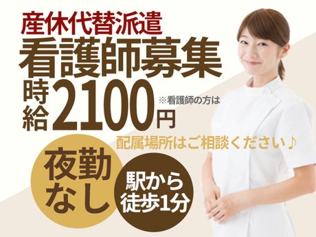 仕事内容 ■総合病院における看護業務 <主な業務> ・バイタルチェック ・医師の診療補助 ・注射、点滴、採血 ・食事、入浴、排泄の補助 ・体位交換 ・看護記録の作成 ・褥瘡の処置など ・ナースコール対応、巡回 など <派遣先> 全80床総合病院 【診療科目】内科・消化器内科・循環器内科・呼吸器内科・神経内科・放射線科・外科・整形外科・脳神経外科・形成外科・リハビリテーション科 <受動喫煙対策> あり(屋内禁煙) <新型コロナウイルス感染防止対策実施> マスク着用での勤務、アルコール消毒液完備などの感染対策をし、患者様もスタッフも守れるよう体制を整えています。 ここがポイント \産休代替派遣のお仕事/ ■うれしい高時給2000~2100円! ■8:30~17:00(実動7時間30分) ■週3日勤務よりご相談ください ■産休、育休代替派遣でのお仕事です ■病床数80床の総合病院 ■配属場所はご相談ください ■最寄駅より徒歩1分と超駅チカで通勤便利