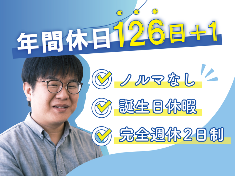 休日休暇 *完全週休2日制(土・日) *祝日休み *年末年始休暇 *GW・夏季休暇(会社カレンダーによる) *有給休暇(消化率80%以上/6ヶ月経過後10日) *年間休日124日 *お誕生日月休暇 *育児休業・看護休暇(取得実績あり)