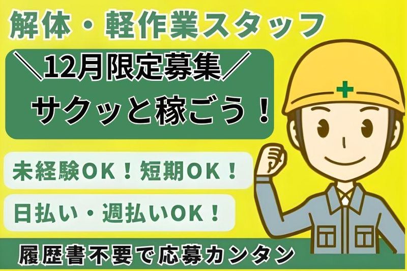 仕事内容 \12月限定!1か月短期スタッフ募集/ 冬休みにガッツリ稼ぎたい大学生さん大歓迎! 日払いOKだから急な出費も安心! 短期間でしっかり稼いで、冬を思いっきり楽しもう✨ 未経験から始められる 解体・軽作業スタッフ の募集です。 道具や作業着は会社が用意するため、準備ゼロでスタートOK! ⏰勤務日数に応じて特典ボーナス有り⏰ ・10日勤務で1万円! ・さらに20日勤務で2万円!! 【ココで働くおすすめポイント】 ■履歴書不要&即面接&即勤務OK ■日払い・週払いありで急な出費も安心✨ ■日給10,500円~でしっかり稼げる! 【具体的な仕事内容】 ■建設現場での解体作業・土木作業 ■清掃・片付けなどの軽作業 先輩がしっかりサポートするので安心して働けます! =========== ✅誰でも始めやすい! =========== 特別なスキルや経験は一切不要! ほとんどのスタッフがゼロからスタートしています。 先輩がしっかりサポートするので、初めてでも安心です✨ 「体を動かしたい!」 「冬休みの短期で試してみたい!」 そんな気持ちだけでOK! =========== ✅日払い・週払いOK! =========== 「冬休みは遊びもイベントも多すぎる…!」 「クリスマスも年末も出費ラッシュ…!」 そんな時でも安心✨ 働いた分はその日にすぐGETできるから、 急な予定にも余裕で間に合う! 金欠の不安をゼロにして、大学生活もっと自由に! ======== ✅応募もカンタン! ======== 授業やサークルで忙しい大学生でも大丈夫! 事務所まで来られない方は【出張面接OK】! しかも履歴書なしでOK! 手ぶら&スキマ時間でサクッと面接できちゃいます✨