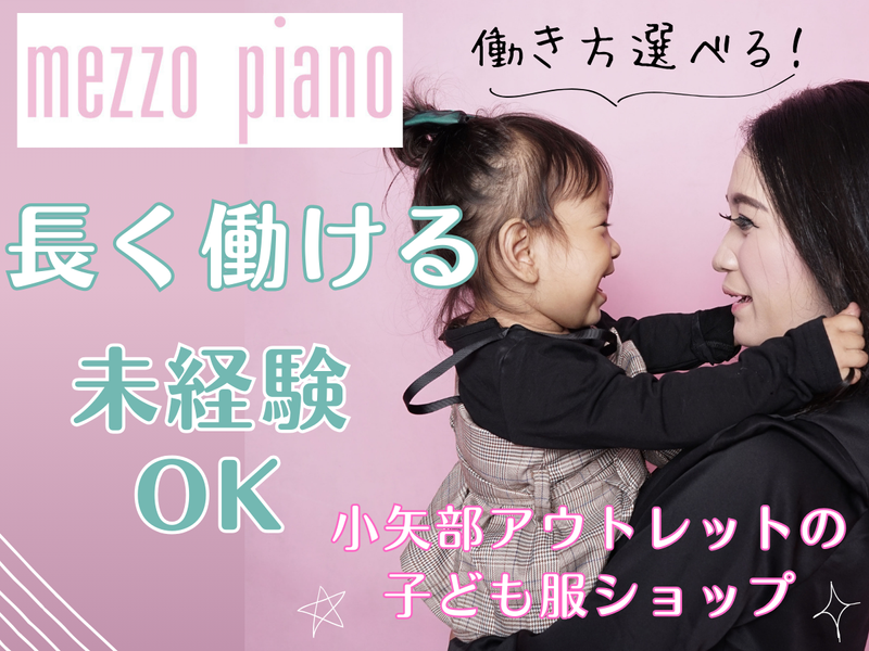 仕事内容 mezzo piano(メゾピアノ) 可愛いお洋服や雑貨が沢山! 幅広い年代に愛されるキッズ服ブランドで 一緒に働きませんか? ⭐今回はひさびさのスタッフ募集。 フルタイムでしっかり働きたい方も、 時短で無理なく働きたい方も歓迎です! \北陸最大級*三井アウトレットパーク小矢部/ ■ここポイント ✅フルタイム・時短どちらもOK ✅未経験・ブランクOK/販売デビュー応援 ✅ノルマなし/落ち着いた接客ができる ✅私服勤務OK/余分な出費なし ✅お洒落OK/ネイル・ピアス・髪色自由 「久しぶりのお仕事復帰」 「家庭と両立しながら働きたい」 そんな方にもぴったりの環境です。 ======================== ■お仕事内容 【フロア業務】 ・お客様対応 ・レジ ・商品整理、おたたみ ・ディスプレイ 【バックヤード業務】 ・入荷した商品の検品 ・在庫管理 ・品出し ・シール貼り ✨子供服の知識がなくても大丈夫! 優しい先輩スタッフが丁寧にお教えします ので働きながら少しずつ覚えていただければ OKです! ▼アパレル未経験の方へ▼ 接客が初めてでご不安な方は バックヤードからスタートも可能! 経験・ご希望に合わせて無理なく始められます。 ▼勤務時間・働き方▼ ・フルタイム ・時短勤務 ・早番のみ/遅番のみ ・土日のみ 「しっかり収入を確保したい」 「家庭や育児と両立したい」 「Wワークで働きたい」 などのご希望もお気軽にご相談ください♪