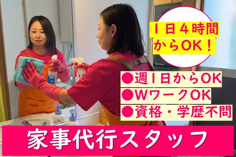 【雇用形態】 アルバイト・パート 【契約期間】 パートアルバイトのため契約条件による ※試用期間なし 【その他】 保育士(保育スタッフ)、看護師・准看護師、介護職員の方のWワークも歓迎です。 家政婦や清掃スタッフ、そうじスタッフ、ハウスクリーニングスタッフなどに携わっていた方をはじめ、客室清掃、施設清掃、ハウスキーパーなどの清掃関連の仕事をされていた方もぜひご検討ください。 調理スタッフやキッチンスタッフ、料理教室、調理補助などお料理のお仕事に興味のある方も一度お話ししませんか。 ハローワークを通じて、お掃除やお料理など家事代行のお仕事をお探しの方からのご応募もお待ちしております。 40代から50代まで幅広いスタッフが活躍中です。