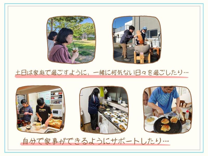仕事内容 ✅電話でのお問い合わせ 「求人をみました。」 とお電話ください! ➡ 0532311900 ⭐週2.3日程度勤務 ⭐平日は朝7:30~9:30 夕方は15:00~20:00、 土日は11:00~20:00のうち 半日~OK! ⭐土日どちらか出られる方歓迎 ⭐扶養内勤務OK! ※「お世話」ではなく 「見守り」が中心のお仕事です。 障がいのある方が暮らす グループホームでの生活支援スタッフ といっても、 介護のように「何でもやってあげる」 お仕事ではありません。 私たちのグループホームは、 将来的に“自立して卒業していくこと”や “ここまでできるようになる”などを いろんな背景のある方の~住まい。 そのため大切にしているのは、 利用者さんが 「自分でできることを、 ひとつずつ増やしていくこと」です。 ✅掃除や洗濯を代わりにやるのではなく、 やり方を伝えたり、そっと見守ったり ✅料理も、すべて作るのではなく 一緒に考えたり、横で見守ったり ✅困ったときに声をかけ、相談に乗る存在 ✅土日は、季節のイベントをやったり 散歩に行ったり、何気ない日常を過ごしたり まさに、 子育てで「見守ってきた経験」が そのまま活かせる仕事です。 【具体的なお仕事内容】 ■ 利用者さんの声かけ・見守り ■ 食事作りのサポート(見守り中心) ■ 掃除・洗濯など生活面のサポート ■ 休日の外出の付き添い (無理のない範囲で/土日メイン) ■ 「今日はどうだった?」と話を聞く時間 ※身体介助はありません ※入浴・排せつ介助などもありません 【利用者さんについて】 ・10代~70代まで、5~7名ほど ・各ホームを1~2名体制で担当 ・就労支援に通いながら 生活している方が中心です 「できた!」という小さな成長を、 一緒に喜べる環境です。 【この仕事のやりがい】 誰かに依存するのではなく、 自分の力で生きていく準備をする場所。 その過程を、 家族のような距離感で支えていく―― それが私たちの生活支援です。 【職場の雰囲気について】 ▶▶▶ @yumeminosato instagramにて、施設の雰囲気などを 発信しておりますので、ぜひご覧ください♪ ~経験は人生をカラフルにする~ そんな想いに共感してくださる方を お待ちしています。