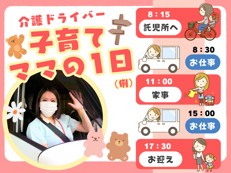 仕事内容 ✅8:30~10:30、15:00~17:30 空き時間に家事や買い物ができる! ✅午前のみ、午後のみもOK! ✅託児所あり(1歳児~小学生まで) 1日100円~利用できる! ✅普通免許(AT限定可)があればOK! デイサービスで、ご利用者さまを 送迎するお仕事です。 運転に不安がある方でも、 最初は先輩と一緒に乗って 慣れていけるので安心してくださいね♪ <具体的には…> ・ご利用者さまのご自宅から施設への送迎 ・送迎の際の持ち物チェックや施錠確認など、安全確認 ・送迎車の軽い清掃や車内整理整頓 ・フロア内での軽作業やサポート業務 <⭐家事や育児と両立しやすい> 午前と午後の業務の間に しっかり空き時間があるので、 買い物や家事をサッと済ませて、 効率よく1日を過ごせます◎ <⭐スタッフ専用の託児所完備> 系列の事業所に スタッフ専用の託児所を完備しており 1日100円〜利用可能です! 朝、お子さんを預けてから出勤し 退勤後すぐにお迎えへ向かえます。 子育てママさんにぴったりの環境です。 <⭐温かい職場で安心して働ける> スタッフ同士、みんなで助け合いながら 仕事をしています。 急なお子さんの体調不良や 学校行事にもしっかり理解があり、 家庭と両立しやすい環境です。 安心して働ける職場で、 一緒にお仕事しましょう! - 『たんぽぽデイサービス森本』について - 一宮市にある定員100名のデイサービス。 「年齢を重ねても楽しさ、希望、 青春の輝きが溢れる社会を目指す」 というビジョンのもと、 お客様の自立支援に力を入れています。 <スタッフに聞いてみました> (入社10年目Oさん・入社5年目Sさん) ✅Q1:入社したきっかけは? Oさん⇒全くの未経験でしたので、 不安もあり、元々は施設の 清掃員として入社しました! 働いているうちに、 介護の仕事が楽しそうに見えて、 思い切ってはじめてみました。 Sさん⇒私は託児所がある 職場を探していて、 たまたま見つけたのが ココで介護は初めて。 先輩に「笑顔と挨拶があれば大丈夫」 って励まされてスタートできました。 未掲載からはじめる人が多いですが、 介護というより、 会話を重視しているので、 近所のおじいちゃんおばあちゃんと 「おしゃべり」をしに 来ている感覚でOKです! ✅Q2:働き続ける理由は? Oさん⇒とにかくいい人が多いから。 本当に毎日ここで働くのが楽しいし、 職場の居心地もよいので、 嘘かと思われると思うけど、 休みの日に 間違えて 来ちゃったこともあります(笑) Sさん⇒4人子どもがいるのでその度に 退職と復職を繰り返したんだけど、 いつも温かく「お帰り」って 迎えてくれるのがありがたくて。 ✅Q3:職場の雰囲気や環境は? Oさん⇒おはようとか、 ただいまとかの挨拶が、 とても身近に感じられる雰囲気。 元気がないとお客様が 励ましてくれるんですよ。 Sさん⇒子育てママさんが多いので、 子どもが熱を出した時なんかも お互い気兼ねなく 休ませてもらえています!
