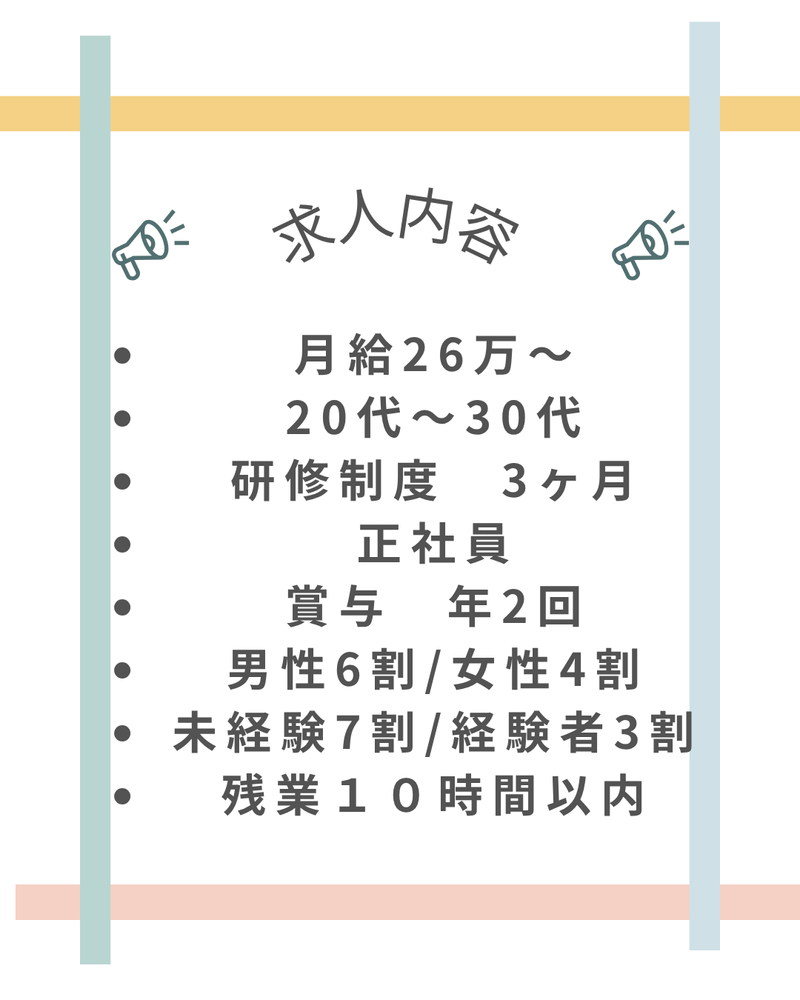 月給260,000円~450,000円 給与詳細 基本給:月給 26万円 〜 45万円 固定残業代:なし 【一律手当】 全員に一律で支払われる通勤・皆勤・家族手当金額:あり 全員に一律で支払われるその他手当金額:なし ・昇給あり ・賞与あり ※経験・スキルなどを考慮し決定します。 ※残業代は全額支給 ※試用期間3ヵ月あり(期間中は、給与・待遇に変更なし) ☆経験がある方は、現職・前職給与を考慮します。 ☆初年度の年収 320万円~600万円 【給与例】 給与例 ◆年収360万円(1年目・23歳/月給26万円+賞与年2回) ◆年収460万円(3年目・28歳/月給32万円+賞与年2回) ◆年収610万円(5年目・35歳/月給40万円+賞与年2回)