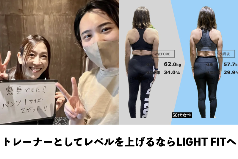アピールポイント: 【LIGHT FIT で働く魅力】 ◉トレーナーとしてレベルを高められる環境 外部講師や顧問の日本トップトレーナーによる研修が定期に開催されており、今の技術が不安でも安心ください。1年で驚くほど技術を上げ、大阪病院の講演会に呼ばれるほど成長したトレーナーもいます。 ◉年収800万円越えも在籍 LIGHT FITは業界最高水準でトレーナーへ還元しているため、トレーナーのレベルが高くお客様のリピート率がトップクラスに高いです。そのため広告宣伝費が浮いた分を更にトレーナーへ還元しているため好循環が生まれており1年目で月収50万円や2年目で年収800万円に到達する人もいます。 ◉中長期に渡って活躍できる LIGHT FITは中長期的に気持ちよく働いて頂けるように、さまざまなキャリアアップを用意しています。トレーナースクールの講師や、講演活動、店舗責任者、独立など様々なキャリアを選んで頂けます。現場だけ、稼げるだけではなく、好きな仕事、したい仕事を選べる環境を大切にしています!