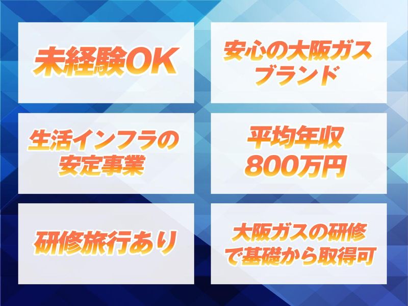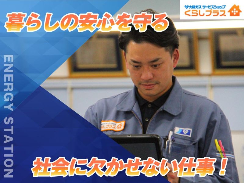 仕事内容 「安定×スキルアップ」で収入UPを実現  ̄ ̄ ̄ ̄ ̄ ̄ ̄ ̄ ̄ ̄ ̄ ̄ ̄ ̄ ̄ ̄ ̄ ̄ ̄ 【ガスのプロ】として、 専門知識とスキルを身につけることで、 資格取得&収入UPが可能です。 経験を積み、作業スピードや安全に対する知識を 身につけていくことで、収入アップが実現できる。 安定した収入を得ながら、長く続けられる仕事です。 \\ アピールポイント // ✅研修充実だから安心して始められる ✅未経験から月給25万円スタート! ✅大阪ガスブランドの安心感 ✅手順・トークマニュアルあり ✅スキルを身につけて収入UP 【主な仕事内容】 新居や引っ越しに伴う 大阪ガスの開栓を担当します。 1日平均10件ほど、決められた手順で 点検・安全確認・開栓作業を実施します。 実施後は暮らしのお困りごとを聞いて 自社のサービスをご案内、提案して いただきます。 まずは、手順・トークマニュアルを学び、 ゆくゆくは自分の得意を活かして、 幅広い知識とご案内で、 お客さまの安全を守る存在へと成長してください。 【具体的には・・・】 ・ガス機器と設置場所の確認 ・安全基準のチェック ・開栓作業 ・ガス警報器などの安全装置案内 ・連絡体制のもとでの現場対応 など ■未経験でも始めやすいその理由は  ̄ ̄ ̄ ̄ ̄ ̄ ̄ ̄ ̄ ̄ ̄ ̄ ̄ ̄ ̄ ̄ ̄ ガスの開栓という 生活インフラに欠かせない業務から スタートします。 手順通りの作業が中心で、 手順・方法を覚えていただくと、 1人でスムーズに仕事を進めることができます。 また、大阪ガスの研修センターで 基礎から学べるため、初心者でも 安心して現場に立てます。 現場では先輩が常に近くにおり、 分からないことはいつでも 質問できる体制が整っています。 「未経験だから不安」という方も、 一歩ずつスキルを身につけられる 環境を用意しています。 ■暮らしの安心を支えるとは  ̄ ̄ ̄ ̄ ̄ ̄ ̄ ̄ ̄ ̄ ̄ ̄ ̄ ̄ ̄ ̄ ̄ ガスは生活に欠かせないインフラです。 安全に使っていただくため、 開栓時の点検・確認はとても重要です。 安全を確認して、ガスの開栓をしたあとは、 安心した生活を守るための、 安全装置の案内を徹底しています。 簡単に言うと、 大阪ガスを利用するお客さまの生活を守る『チェッカー』。 あなたのチェックが お客さまの“安心して暮らせる毎日”を 支える役割につながります。 ガスを安全に利用いただくために知識・経験を身につけ、 お客さまの暮らしの安全を支えてください。 ~エネルギーステーションの魅力~ \業績好調!安定基盤で成長を続けるインフラ事業/ ガスは生活に欠かせないインフラ。 景気や社会情勢の影響を受けず、需要が安定しているため、 じっくりとキャリアを築くことが可能です。 私たちは大阪ガスサービスショップの中でも、 関西最大級となるお客さまを担当しています。 20年前は3拠点が、現在では18拠点にまで拡大。 今後も、事業拡大を見据える私たちの成長は、まだまだ止まりません。 \充実した研修制度/ 未経験からでも安心して始められるよう、 大阪ガス研修センターでの研修と、OJT教育制度を整えています。 安定した収入を得ながら、 着実にスキルを身に着けていくことができます。 \平均年収800万円!給与水準の高い環境/ 営業の平均年収は約800万円! (平均月給45万円+賞与年2回+決算賞与) ▼キャリア別モデル例 年収600万円 /月給35〜40万円位+賞与 年収880万円 /月給40〜45万円位+賞与 入社年次、年齢、性別関係なく、 公平に評価する制度や環境があります。