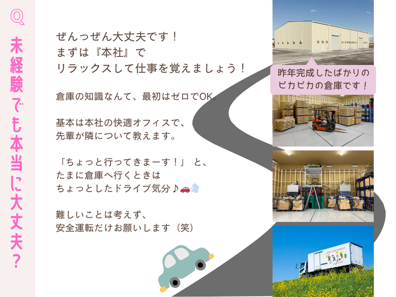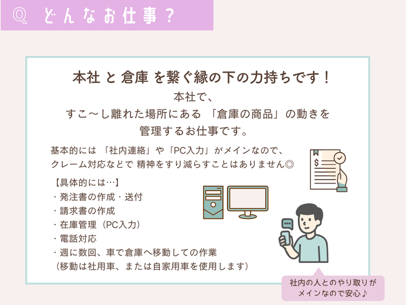 仕事内容 \「本社」にいながら「倉庫」を支える!?/ \基本はオフィス、たまにドライブ。メリハリ重視の働き方/ 「事務の仕事はしたいけど、 ずっと座りっぱなしは飽きちゃう…」 「快適なオフィスがいいけど、 人間関係はサッパリがいい」 そんなあなたにピッタリなのが、 当社の【倉庫管理事務】です! 実は、管理していただく 「木造エシカル定温倉庫」は完成したばかり。 倉庫内の事務スペースがまだ準備中のため、 基本的には「本社(安城市大東町)」での勤務となります! 本社は空調完備で快適そのもの。 でも、たま~に 「現地の確認」や「軽い作業」で 倉庫に行くこともあります。 本社から倉庫までは車で片道15分ほど。 もちろん移動時間もお給料が発生しますし、 「あ~、いい気分転換になった!」 とスタッフには好評なんですよ♪ ✨トリイアンドカンパニーの魅力✨ ✅ 基本は本社勤務! 空調の効いた快適なオフィス ✅ たまにドライブ! 倉庫への移動が良い息抜きに ✅ 年間休日125日! 土日祝はしっかりお休み ✅ 17時定時&残業ほぼなし! 夕方は自分時間 ✅ ネイル・髪型・服装ぜんぶ自由! ■お願いするお仕事は…? (本社と倉庫をつなぐ・縁の下の力持ち) ┈┈┈┈┈┈┈┈┈┈┈┈┈┈┈┈┈┈┈┈•• 本社にあるデスクで、 離れた場所にある 「倉庫の商品」の動きを管理するお仕事です。 基本的には 「社内連絡」や「PC入力」がメインなので、 クレーム対応などで 精神をすり減らすことはありません◎ 【具体的な作業】 ・発注書の作成・送付 ・請求書の作成 ・在庫管理(PC入力) ・電話対応(取次ぎや確認連絡など) ・週に数回、車で倉庫へ移動しての作業 (移動は社用車、または自家用車を使用します) 基本はPCでの入力作業が中心。 難しい関数などは使いません。 フォーマットへの入力やコピペができればOKです! ■未経験でも大丈夫? ┈┈┈┈┈┈┈┈┈┈┈┈•• 倉庫の管理者(松尾さん)や 本社の先輩スタッフ(馬場さん)が マンツーマンで指導します! すぐに聞ける距離に先輩がいるので、 「倉庫で一人ぼっちで不安…」 なんてこともありません(笑)。 自分のペースで 少しずつ仕事を覚えていってくださいね。