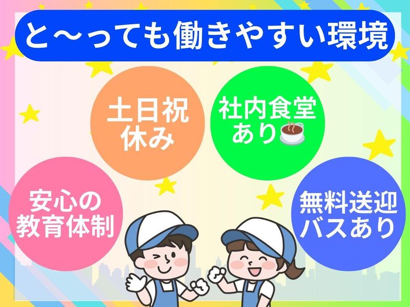 【保険制度】 雇用保険、労災保険、健康保険、厚生年金 待遇・福利厚生 【福利厚生】 ⏩交通費支給 ⏩社会保険完備 ⏩有給休暇 ⏩制服貸与 ⏩直接雇用制度あり ⏩休憩室あり ⏩更衣室あり ⏩ロッカーあり ⏩社員食堂あり ⏩無料の送迎バスあり ⏩自転車通勤OK ⏩空調完備