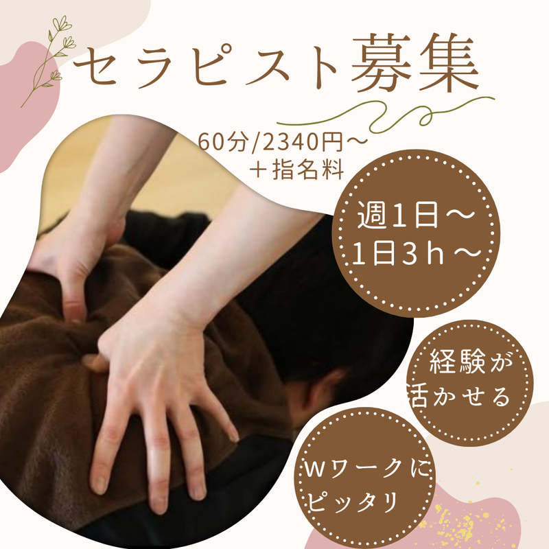 仕事内容 ✨高歩合制でしっかり稼げるチャンス!✨ / 15時からラスト勤務なら1時間あたり… ▶▶▶2418円~4020円◀◀◀ 昼から夜にかけて働ける方は、さらに高収入も可能です♪ \ 未経験だけど、手に職付けたい方や 昔やった事あるけどしばらくブランクあるしな・・・ って方も大歓迎です◎丁寧に教えます! ⭐月給最低保証付きなので安心して働ける◎ ※条件面はお気軽にお問い合わせください!! 【仕事内容】 ⏩予約・来店されたお客様への施術対応 ⏩施術はオールハンドで「もみほぐし」が中心 ⏩経験者は即戦力として活躍可能 ★経験者も未経験者も大歓迎! エステやリラクゼーション経験者はもちろん、 初心者も丁寧にサポートします! ========== ➰こんな働き方が可能! ▶「午後だけ」「スキマ時間だけ」「フルタイムでガッツリ」 ▶15時~ラストで高歩合で稼ぐ ▶Wワークの合間少しだけ ▶子どもが学校に行っている間だけ ▶ブランク明けで短時間からスタート ➰嬉しいポイント! ▶駅チカで通勤ラクラク! ▶経験者はスキルを活かして即戦力! ▶未経験でも研修ありで安心スタート! ➰職場の雰囲気もとってもリラックス! ▶仮眠OK・食事OK・スマホタイムOK! ▶お客様が来たらしっかり施術! 空き時間もリラックスできる環境だから、無理なく長く働けます◎ ╭━━━━━━━━━━━╮ ✨当店からのメッセージ✨ ╰━v━━━━━━━━━╯ お客様に”手のぬくもり”を通して笑顔を届けるお仕事です★ 丁寧な研修があるので、未経験でも安心です◎ あなたの笑顔とやる気を活かして、一緒にお客様を癒しませんか?