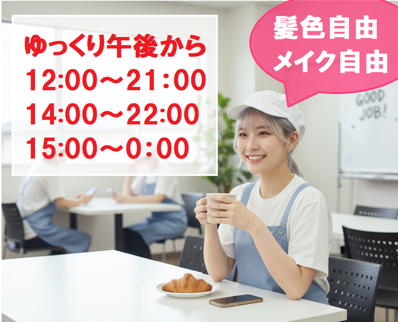 勤務時間詳細 あなたの生活リズムに合わせて 下記①~⑧から選べます。 ⏰毎日同じ時間の固定勤務です ⏰残業は基本的になし 【日勤で規則正しく】 ①8:00~16:00 ②8:00~17:00 ③9:00~18:00 【午後からゆったり】 ④12:00~21:00 ⑤14:00~22:00 ⑥15:00~0:00 【夜勤でガッツリ稼ぐ】 ⑦20:00~5:00 ⑧23:00~8:00 ★実働7~8h(休憩1h)/週4日~OK ★22時〜翌5時は時給25%UP(時給1563円!)