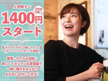 仕事内容 【この求人のポイント】 *オープニングだからみんな一緒のスタート♪ *全席タブレット導入 *髪色・ピアスなど自由 *まかない無料&リクエストもOK! *新店舗OPENまで姉妹店で働くこともOK!即勤務も可能!(同条件) 【オープニングスタッフ大募集です】 みんな同じスタートだから安心♪ 全席タブレットを導入しているので、オーダーを取りに行く必要はありません。 初バイトの方でも安心して働けますよ◎ 清潔感があれば髪色やピアスなどオシャレも自由です! どこまで大丈夫か不安な方はご相談くださいね。 まかない無料!リクエストOK! おかわりも自由です◎ 既存の姉妹店では唐揚げやチャーハン、焼きそばなど、 いろいろなまかないを提供中! 新店舗でも和・洋・中いろいろなまかないが食べられますよ! お腹いっぱい食べて帰って下さい(笑) 【仕事内容について】 ホール業務全般をお任せします。 <具体的には・・・> ・お客様を席へご案内 ・配膳 ・レジ対応 ・テーブルのセッティング ・片付け ・店内の清掃…など 【フォロー&サポート体制もばっちりです!】 新人さんの教育はしっかりあります! できることからお任せしていきます。 まずは明るく「いらっしゃいませ!」「ありがとうございました!」と挨拶ができればOK◎ ルール、席のセットの仕方、テーブル番号などもしっかり教えます! 心配な方はマンツーマンでしっかりとフォローするので安心してくださいね。 【オープン前に姉妹店での勤務も可能です】 希望者は以下の住所にて6月17日のオープンまでの間、 勤務することが可能です。※同条件 (1)東京都台東区上野6丁目8-8 POKKE4F (2)東京都港区六本木4-9-9 東瑙ビル B1F 【アルバイトから正社員への道も!】 希望すれば、正社員への道もありますよ♪ ゆくゆくは社員になりたい方も歓迎! 実際に他店舗で社員になった方もいます。