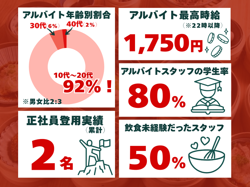 求めている人材 人と話すのが好きな方 周りに自慢できるくらい料理上手になりたい方 活気のある職場で働きたい方 同年代のスタッフと働きたい方 未経験スタートも歓迎!(マンツーマンで丁寧に教えます!)