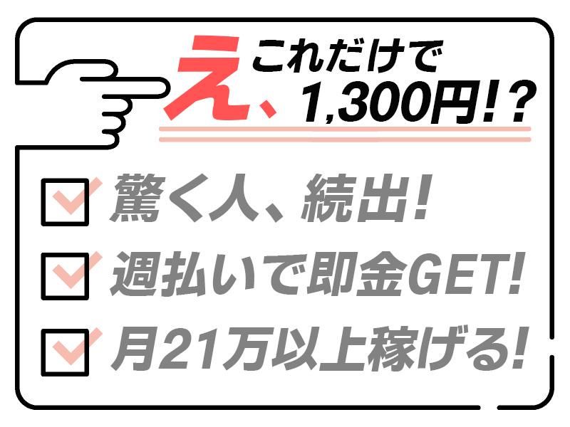 時給1,300円以上 給与詳細 基本給:時給 1300円 〜 ・週払いあり ・昇給あり 【給与例】 給与例 ▼月収例 211,575円 (時給1,300円×7.75h×21日勤務の場合) ※残業なしでも安定してしっかり稼げます!
