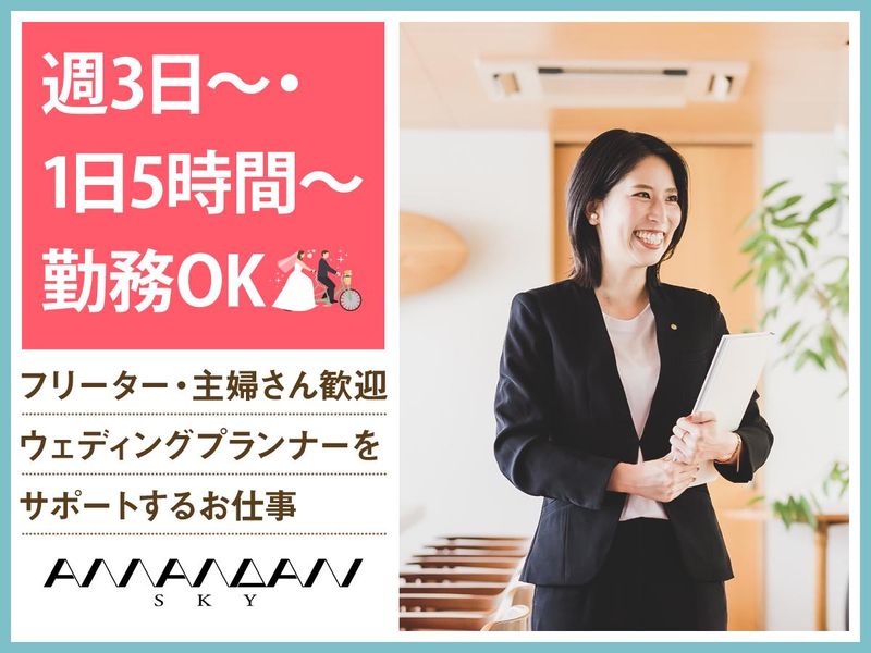 求めている人材 ✅未経験者歓迎 ✅主夫・主婦歓迎 ■週3日勤務可能な方 ■PC入力ができる方 ※ExcelやWordは詳しくない… という方でも問題ありません! 事務業務メインではありますが、 お客様と接する機会も多いため、 お人柄重視の採用です* ブライダルスタッフや 事務スタッフとしてのご経験は不問ですが 接客業や受付、一般事務、営業事務などの ご経験がある方は活かしていただけます。 もちろん、未経験の方もご安心ください◎ 必要なスキルは全て研修でお教えします♪ 未経験からでも問題なくスタートできる環境です◎ \こんな方もぜひ/ ■ホスピタリティを活かしたい方 ■ウェディングやブライダルへの憧れ・興味がある方 ■やりがいのある仕事に就きたい ■感謝される仕事をしたい ■笑顔が多く安心して働ける職場を探している ■土日メインで働きたい方 ■Wワークで勤務したい ■車通勤可能な方優遇 ■土日祝勤務に入れる方優遇 ■フルタイム勤務できる方優遇 ◇無資格歓迎 ◇Wワーク歓迎 ◇ブランク歓迎 ◇資格不問 ◇学歴不問 ◇経験不問 ◇扶養内勤務歓迎 ◇フリーター歓迎