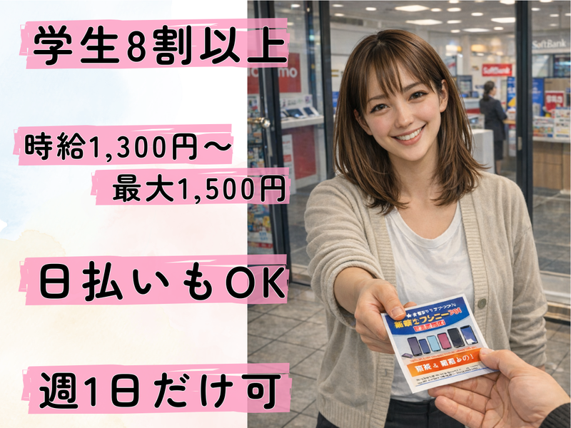 仕事内容 【就活前に社会経験を積みたい方へ】 ✨大学3年生におすすめのイベントバイト✨ 就職活動が本格化する前に、 社会人として必要なコミュニケーション力や 現場対応力を身につけたい方に最適。 接客を通じて社会経験を積みながら、 効率よく収入も確保できます。 \\ このお仕事のポイント // ✅土日祝のみのお仕事(平日は無し) ✅在籍スタッフの約8割が大学生 ✅未経験スタートでも【時給1,300円~】 ✅勤務回数や習熟度に応じて【最大1,500円まで昇給】 ✅1日単位で働けて【日払い対応】 ✅電車代・ガソリン代など【交通費は全額支給】 ✅予定に合わせて働ける【自由シフト制】 ―――――――――― ★働き方の特徴★ 短時間・週1勤務OK 土日祝のみOK スキマ時間を収入にできる 登録制だから予定に合わせて働ける ―――――――――― 新潟県内で携帯電話・スマートフォン、 TVゲームやトレーディングカードを扱う 専門店を14店舗展開する 「COMG!(コング)」にて、 イベント運営をサポートするスタッフを募集中! 人と接することが好きな方、 にぎやかな雰囲気の中で働きたい方にピッタリ。 「春休み・夏休みだけ」「予定が空いた日だけ」などの スポット勤務も大歓迎です! - 【仕事内容】 新潟県内の「COMG!(コング)」各店舗前で、 お子様向けグッズやチラシを配布しながら イベントへのご案内を行います。 ご来店後は、 専門の担当スタッフへバトンタッチすればOK。 慣れてきた方には、 携帯料金の見直し案内やプラン比較などにも チャレンジ可能。 成果に応じてインセンティブも支給されます。 ※ノルマや押し売りは一切ありません。 明るく前向きなメンバーが多く、 年齢や立場に関係なく話しやすい職場環境も 当社の特長です。
