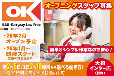 仕事内容 【 お仕事内容 】 ★モクモク作業が得意な方に ★未経験歓迎/主婦活躍中 ★午後だけ/短時間OK ――――――――――――― こんなことをお任せします! ――――――――――――― ■商品の数量チェック 届いた商品と伝票を見比べて、 品名・個数を確認! ■ハンディ端末を使った入力業務 確認した内容を、 ハンディ端末や物流システムに入力します。 ※普段からスマホを触ってる方ならできる カンタンな業務です◎ 「人と話すより、集中して業務したい」 そんな方にもおすすめのお仕事です! 【 オーケーの魅力♪ 】 ■仕事終わりにそのまま買い物できる♪ 「時間も手間も節約できて助かる!」 という声が多数届いています! ■自分のスタイルに合わせて 週2~5日でムリなく働ける! 家事や育児、プライベートと 両立しやすい働き方が可能です! 「家庭優先で働きたい」 「久しぶりの職場復帰で少しずつ始めたい」 そんな方にもピッタリです! ■ゆとりある人員配置で安心 1店舗あたり社員さんが22~23名いるので わからないこともすぐに相談できて安心♪ 業界的にも社員数が多い職場だから、 とっても心強いですよ! 【 しっかりした研修あり 】 \\2026年1月から研修スタート!// 新店オープンに向けて、 しっかり準備ができる体制が整っています! <事前研修あり> ・他店舗での“お試し勤務”で現場を体感! ・合同研修で仲間と一緒に学べる♪ ⇒既存店舗で、仕事のやり方やルールまわりなど 基礎から実践までじっくり身につけられます! < オープン後のサポートも充実> ・経験豊富な社員がしっかりサポート! ・分からないことも、すぐに聞ける環境◎ ⇒オープン初日から1人にさせない安心の職場です♪ 【 大泉インター店へのアクセス詳細 】 <バスの場合> 国際興業バス「比丘尼橋」下車、徒歩1分 ・地下鉄成増駅から乗車の場合 「成増駅南口」バス停から14分 ※平日は1時間に5本~6本 休日は1時間に4本~5本 ・石神井公園駅から乗車の場合 「石神井公園駅北口」バス停から15分 ※平日は1時間に4本~6本 休日は1時間に3本~5本 <徒歩の場合> 西武池袋線「大泉学園駅」から徒歩25分! 西武池袋線「大泉学園駅」北口を出て グランエミオさん手前のエスカレーターを降ります。 そのまま東急リバブルさん方面へ直進し、 交差点を右に渡ります。 靴流通センターさんを通り過ぎ、1つ目の路地を左折。 すぐに右折し、道なりに進むとT・ジョイさんが見えてきます。 T・ジョイさんを過ぎ直進し 大通りに出ると左手にお店があります。 ※自転車通勤応相談 【 勤務形態について 】 この求人はアシスタントパートナー社員の募集です! アシスタントパートナー社員とは? アルバイト・パートとして、週20時間未満で働く 扶養内勤務可能な勤務形態です! ※アシスタントパートナー社員以外には パートナー社員という働き方もあります。 社会保険に加入でき、週20時間以上働く勤務形態です。 週40時間のフルタイム勤務など 契約社員のような働き方も可能です。