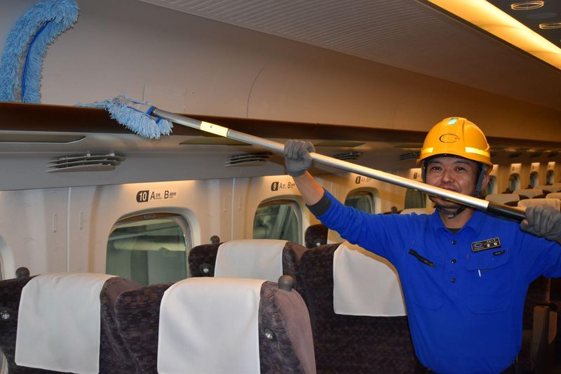 新幹線の車庫で、車両内の清掃スタッフ|福利厚生充実