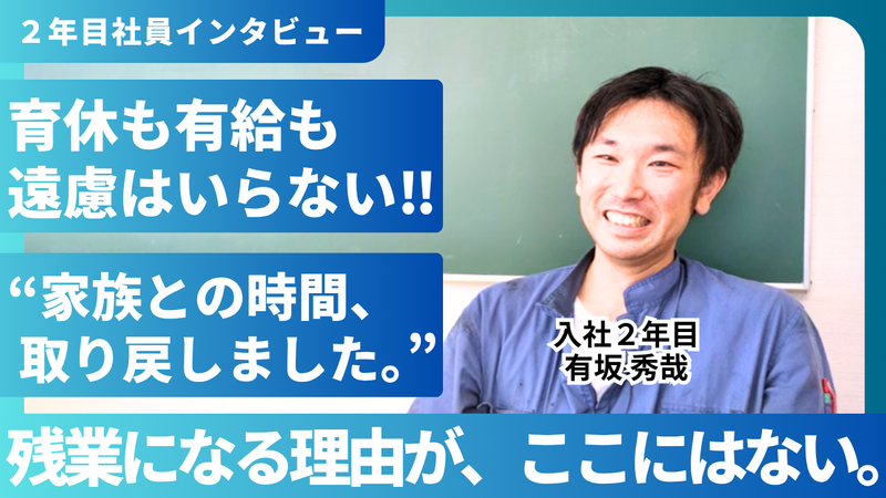 休日休暇 隔週休2日制(日祝+第2・4土曜日) ※その他事業所休日、 2月・3月の繁忙期の 土曜日は会社カレンダーによる 【休暇制度】 ■年末年始休暇 ■夏季休暇 ■GW休暇 ■産休・育休あり ⇒最長2ヶ月間の男性の 育児休業取得実績あり! ■有給休暇 (6ヶ月経過後10日付与) ⇒有給休暇を取得しやすい環境です! ⭐年間休日101日 #長期休暇あり #連続休暇取得可能 #家庭都合休OK #産休・育休取得制度あり