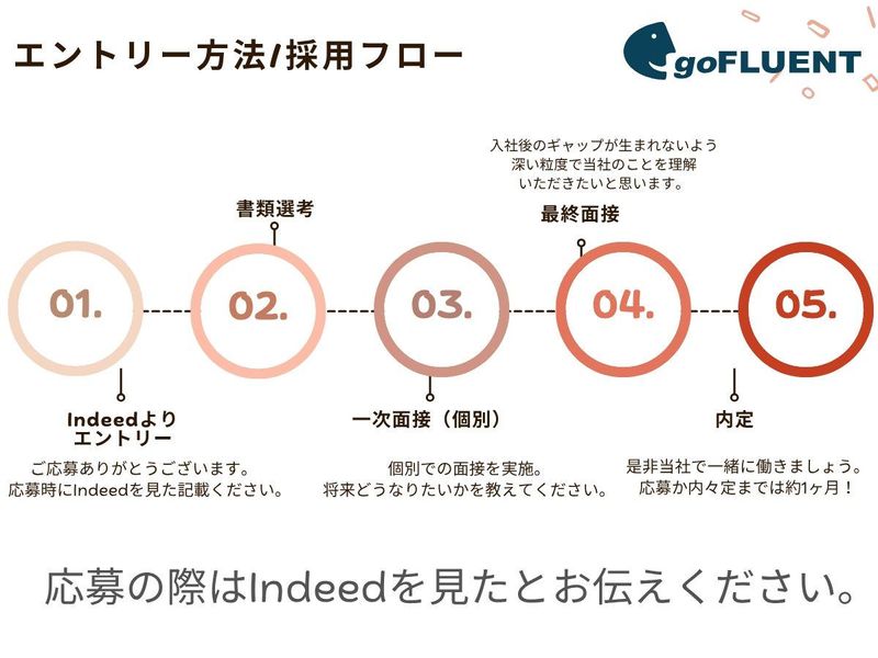 選考プロセス 1. 書類選考 2. 面接(複数回/オンライン・対面) 3. 最終面接(英語対応あり) 4. 内定 ※応募から内定まで約3週間 ※入社日はご相談に応じます 「応募する」ボタンよりご応募ください。 ご不明点があればお気軽にご連絡ください。