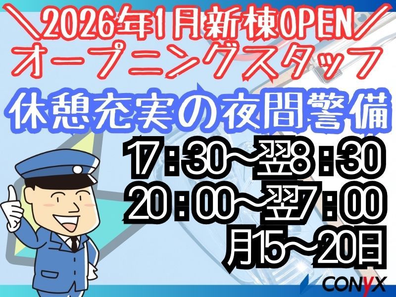 【仕事内容】 ⭐未経験OK/休憩多め⭐ \2026年1月新棟オープン!オープニングスタッフ募集!/ ⭕最新設備の新しい環境! ⭕広々とした警備室で勤務出来ます! 【主な仕事内容】 ✅防災センターにて監視業務 ✅病院内の巡回 ✅緊急時対応 など、 未経験の方でも経験にかかわらずスタートできるお仕事です。 【おすすめポイント】 ⭕休憩時間多め!リフレッシュしながら無理なく勤務OK ⭕複数人でフォロー体制充実◎ ⭕個室の休憩室あり! ~~~~~~~~~~~~~~~~~~~~~ 充実したサポートが自慢です ~~~~~~~~~~~~~~~~~~~~~ 創業70年以上のコニックスだからこそ、 働くスタッフへのフォロー体制は抜群です! ⭐覚えられるまで丁寧にしっかりとサポート! ⭐必要時には担当スタッフがすぐにフォロー! まずはご相談からでも、 お気軽にご応募ください! 【求人ID-AZR03A】