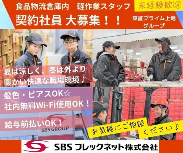 仕事情報 ● 仕事内容 大手スーパーマーケットやコンビニ向けの乳製品やお惣菜、お弁当などの入荷・仕分け・出荷のお仕事です。間違いを減らすために業務を簡素化していますので、初めての方も覚えやすいお仕事です。台車を使用いたしますので、体力的な負担が少なく、健康的に働けます。夏は涼しく冬は外気より暖かい快適な職場環境です。 未経験でも簡単お仕事 伝票のバーコードを読み込んで、荷物を種類ごとに仕分けするお仕事のため、初めての方も覚えやすい仕事です。接客のお仕事はなく、モクモク・コツコツとお仕事したい方におすすめです。未経験者でも安心してお仕事を始められるように、先輩スタッフがやさしくサポートします!すぐにテキパキお仕事できるようになりますよ。 さん付けで呼び合う職場☆ 職場内では役職者も含めて全員を「さん」付けで呼びあい、みんなが遠慮なく意見を言い合える環境づくりを心がけています。また、職場の掲示板にはみんなのおススメのお店やサークル活動、イベントなどを紹介し、和気あいあいとした雰囲気です。髪色ピアスも自由♪休憩中は社内Wi-Fiを使って休憩室で快適に休憩できます。 スマホで簡単給与前払OK! スマホで簡単3ステップ!支給日前に給与を受け取れます!福利厚生の一環として振込手数料は全額会社負担で、急な出費や嬉しいイベントでの出費などでももちろん利用OK!上長承認や理由記載はありません。申請後1時間ほどでご自身の口座に入金完了いたします。 東証プライム上場安定性◎ SBSフレックネットがお届けするのは、お客さまの生活に欠かせない食品。会社の強みである輸配送全国ネットと、低温管理ノウハウは、お客さまの安心安全な「食の当たり前」を支えます。3温度帯に対応できる会社として、業界トップクラスの品質と実績を持つSBSフレックネットで誇りをもってお仕事しませんか?