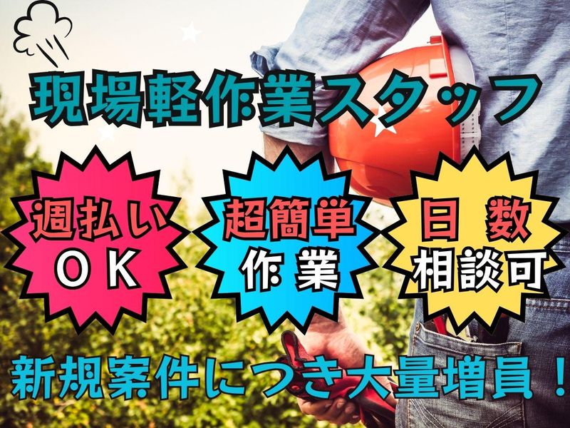 求めている人材 <こんな方におすすめ!> ・体を動かすのが好きな方 ・軽作業・清掃・内装補助などの経験を活かしたい方 ・建築・内装・リフォーム業界に興味のある方 ・短期でしっかり稼ぎたい方 ・安定して働きたい中高年・シニアの方 \20代〜50代まで幅広く活躍中!/ 未経験から始めた方が多数定着しています! <<スタッフの声>> 「単純作業だからスグ慣れる!最初は緊張したけど、先輩が丁寧に教えてくれて安心でした。」 「直行直帰できて通勤ストレスゼロ。週払いOKなのも助かる!」