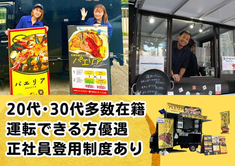 仕事内容 ✅おすすめポイント =========================== 【 未経験でも始めやすい業務内容 】 シンプルな調理補助と販売業務が中心です。 事前研修と先輩スタッフのサポートがあり、 飲食業が初めての方も安心して働けます。 【 移動時間もすべて給与対象 】 金町のセントラルキッチンに集合し、 キッチンカーで各販売先へ移動します。 移動時間も勤務時間として給与を支給します。 【 固定店舗ではない働き方 】 千代田区・新宿・港区などのオフィス街や イベント会場での販売が中心です。 日によって販売場所が変わるため、 同じ場所での単調な勤務が苦手な方に向いています。 ✅仕事内容 =========================== シーフードパエリア専門のキッチンカー 「BOX LUNCH casa」にて、 調理補助・盛り付け・接客販売を担当します。 仕込みはセントラルキッチンで行っているため、 現場では仕上げ・提供が中心です。 フードトラックは軽トラックのため、 普通自動車運転免許(AT限定可)で運転できます。 ✅未経験でも安心スタート! =========================== 研修期間は先輩スタッフと一緒に、 2名体制で移動販売を行います。 分からない事はその場で聞ける環境なので、 初めての方でも安心してスタートできます。 お仕事に慣れてきたら、一人での運営をお任せします。 ✅1日の流れ =========================== ▼(集合) 金町のセントラルキッチンに集合 ▼(出発) キッチンカーで都内各地へ出発 ▼(販売) ランチタイムに販売開始 ▼(終了) セントラルキッチンで片付け ✅運転免許をお持ちの方を歓迎 =========================== キッチンカー(フードトラック)の運営には、 軽トラックの運転業務が含まれるため、 普通自動車運転免許(AT限定可)を お持ちの方を歓迎しています。 入社後は業務を通じて、 軽トラックの運転に慣れていただける環境です。 -* ✅正社員登用制度あり -* 本人の希望や適性に応じて、 正社員登用の相談が可能です。