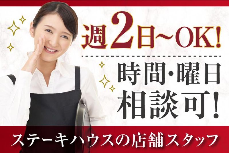 職場環境 生演奏が流れる、落ち着いた雰囲気のステーキハウス。 食事を楽しんで頂けるよう、丁寧な接客をお願いしますね♪ 主婦さん・フリーターさん・高校生・大学生と幅広い世代のスタッフが活躍中! シフト相談はできる限り応じますのでお気軽にご相談くださいね◎