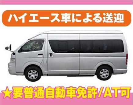 求めている人材 【必須】要普通自動免許(AT限定OK) ※送迎未経験者も超大歓迎 (ハイエース運転できる方) ★学歴不問/経験・年齢不問 ★Wワークの方も大歓迎♪ ★60代以上シニアの方も大歓迎! (60代採用実績多数) ◎20代・30代・40代・50代・60代!主婦・女性・フリーター・シニア/男女幅広く活躍中 <こんな方を歓迎します> ・安全運転を心がけられる方 ・明るく元気な挨拶ができる方 ・早起きが好き!得意な方 ・Wワークで稼ぎたい方 ・土・日・祝日は休みたい方