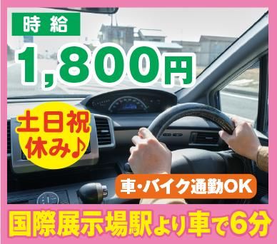 仕事内容 <送迎未経験者も大歓迎!> (簡単な研修で即スタート可) ◎普通自動車免許/AT限定OK♪ (ハイエース車/企業職員の送迎) ◆主婦、女性、シニアの方も活躍中! ◆平日朝6~10時のみ (土日祝休み) ◆コースはほぼ直線道路/片道約2km ◆時給1800円の厚待遇募集♪ (Wワークも大歓迎です) 【勤務地・出勤地】 東京港フェリーターミナル (江東区有明4丁目) ※車・バイク通勤大歓迎 【具体的には】 ・東京港フェリーターミナル~ 国際展示場駅間のシャトル送迎 (渋滞ほとんどナシ!片道約2km) ・ハイエース車(10人乗)による職員送迎 ・簡単な車両の日常点検・給油等 【勤務時間・曜日】 朝6:00~10:00/4h ★月~金/週5日(祝休) 【休日・休暇】 土・日・祝日・年末年始 他、企業カレンダー <働きやすさ抜群です◎> 勤務地へ直行直帰(車・バイク通勤大歓迎)。 朝6:00に出勤後、準備を整え6:15に1便出発~9:50に業務が終了して10時退勤のイメージです。 ☆運行時刻とコースも決まっているのでスグ慣れます。 ※1コースのみ!片道2kmほぼ直線道路(所要時間片道約10分で9便) <女性・中高年・シニア世代も多数活躍中> 20代・30代・40代はもちろん、50代・60代以上の中高年・シニア世代の方も多数活躍中! ◇朝の短時間勤務なのでWワークも大歓迎♪ 未経験の方も安心してスタートできる環境です。
