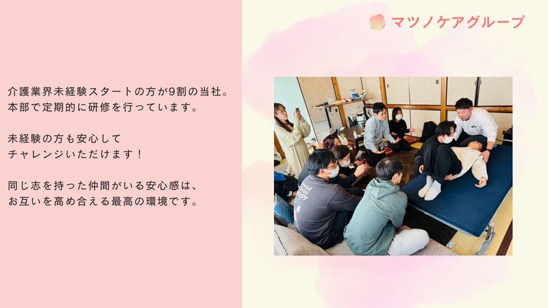 仕事内容 本社:足立区 北千住駅から徒歩5分 支店:世田谷区 千歳烏山駅から徒歩5分 ・勤務場所【現場から直行直帰】 基本的にご自宅の最寄り駅から1時間圏内の直行直帰です ・お仕事内容 1日1訪問で、キチンと向き合える生活支援スタッフをお任せします 【資格取得に必要な費用は全額会社負担】 3日間で取得可能な資格です ✅未経験者大歓迎! 未経験でも月給35万円✨ ✅カジュアル面談もOKです♪ ✅業界でもトップクラスの待遇! <未経験無資格から活躍できます!> ⭐8割以上のスタッフが未経験スタート ⭐学歴・経験・資格は一切問いません ⭐資格取得に必要な費用は全額会社負担 ⭐テレビなどのメディア出演経験も多数! 取材記事がネットにも載っているので、 興味がある方は代表の「松野竜一」で ぜひ検索してみてください。 ・・・・・・・・・・・・・・・・・・・・・・・・・・・・・・・・・・・・・ ⏩求人のおすすめポイント ・・・・・・・・・・・・・・・・・・・・・・・・・・・・・・・・・・・・・ ●訪問は1日に1件のみ ご利用者様としっかりと向き合う 時間があります☆ ●直行直帰可能 ●カジュアル面談OK ●業界トップクラス✨待遇に自信アリ 未経験の方でも月給35万円 ●資格は全額会社負担で取得可能 ●未経験&無資格でもOK! 完全に人柄採用です! 経験・学歴は問いません♪ ●月に1回、ご飯会や会議があるので 自分の希望を伝えられる機会があります! (北千住事務所) ・・・・・・・・・・・・・・・・・・・・・・・・・・・・・・・・・・・・・ ⏩お仕事内容 ・・・・・・・・・・・・・・・・・・・・・・・・・・・・・・・・・・・・・ ⭐働きながら資格を取得できます!! ご利用者様のご自宅に訪問して、 日常生活全般のサポート業務を ご担当いただきます。 <具体的な業務内容> ✅基本的な家事(掃除、洗濯など) ✅食事、入浴、トイレ、着替えの介助 ✅生活に関する相談対応 ✅外出の付き添い(買い物など) ✅医療的ケア(たん吸引など) ✅就寝中の見守り ・・・・・・・・・・・・・・・・・・・・・・・・・・・・・・・・・・・・・ ⏩当社について ・・・・・・・・・・・・・・・・・・・・・・・・・・・・・・・・・・・・・ 株式会社マツノケアグループでは、 指定難病(ALS、筋ジストロフィー等)や 様々な障がいを持つたくさんの方々が、 自分らしく生活できること、また、 やりたいことを可能な限り叶えられるように 日常生活のサポートを行っています。 「全ての人がその人らしい生き方を 実現できる社会」を目標とし、 スタッフが協力し合って取り組んでいます。 支援を必要とする方に 必要な支援を提供できるように、 一緒に福祉業界に貢献しませんか? ――――――――――――――――――― <スタッフインタビュー> Q:この仕事のやりがいは何ですか? Aさん: 一言で表すのは難しいです…! ご利用者様の生活の一部に関わる お仕事なので、楽しい時間を共有して 楽しむといった一つ一つの場面の感情を 共有できるのはまるで家族のようで、 かけがえのない瞬間だと思っています。 Bさん: どのように利用者様にサポートを 提供するか、自分で考えながら 取り組めることにやりがいを感じています! 介護の経験がない状態からのスタートだった ので不安もたくさんありましたが、 先輩が声をかけてくださったり 丁寧にサポートをしてくださったので、 安心してお仕事を続けることができました! ――――――――――――――――――― カジュアル面談を行っているので、 「まずは話を聞いてから決めたい…」 というのももちろんOKです! 応募いただきましたら、チャット内で 「カジュアル面談希望」の旨を お気軽にお伝えくださいね ・・・・・・・・・・・・・・・・・・・・・・・・・・・・・・・・・・・・・ ⏩入社の流れ(資格取得の流れ) ・・・・・・・・・・・・・・・・・・・・・・・・・・・・・・・・・・・・・ 面接▶雇用契約▶資格取得(3日間/会社全額負担) ▶オリエンテーション ▶管理者と一緒にご利用者様と顔合わせ ▶相談後、納得の上で研修同行スタート 管理者およびコーディネーター部長が 独り立ちするまでしっかりとサポートします。 自信を持ってお仕事ができるようになるまで しっかりサポートするので、ご安心ください! ▶独り立ち 独り立ち後の相談なども、 電話や対面で頻繁に行なっています! 安心して介入できる環境です。 ・・・・・・・・・・・・・・・・・・・・・・・・・・・・・・・・・・・・・ ⏩採用担当より ・・・・・・・・・・・・・・・・・・・・・・・・・・・・・・・・・・・・・ 働くスタッフひとりひとりにとって 働きやすい環境であることを重視し、 美容手当などの弊社ならではの 福利厚生をご用意しています。 スタッフ同士の仲が良いので、 みんなでお寿司に行ったりすることも♪ お互いに協力し合って働いています! 3年以上の定着率は90%以上! お気軽にご応募くださいね☆