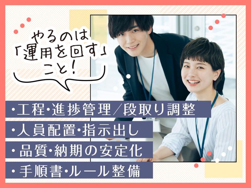 仕事内容 / 物流×キッティング現場の運用リーダー 工程・進捗を動かすポジション \ 物流やキッティング業務の現場で、 工程管理・進捗管理を担い、 品質と納期を安定させる仕事です。 現場の状況を見ながら、 段取り・配置・ルール整備まで含めて 運用を回します。 紹介予定派遣(最長6ヶ月)でスタート。 現場を理解した上で、双方合意により 正社員登用となります! ■主な業務(物流&キッティング)  ̄ ̄ ̄ ̄ ̄ ̄ ⏩進捗/工程の管理、日々の段取り調整 ⏩メンバーの配置・指示出し、育成フォロー ⏩品質チェック・課題の原因整理、 改善の実行 ⏩手順書/チェックリストの更新、 運用ルール整備 ⏩外部業者との調整(納期・受け入れ等) ■直雇用後について  ̄ ̄ ̄ ̄ ̄ ̄ ̄ ̄ ̄ ̄ 【雇用形態】 正社員 ※派遣期間最大6ヶ月後、 双方合意のもと正社員登用予定 【給与】 ■ライン責任者候補:月給35万円~ ■センター長候補:月給50万円~ ※経験・能力を考慮の上、決定します。 ※試用期間2ヶ月 (期間中の待遇に変更なし) ◎給与内訳について ■ライン責任者候補:月給35万円~ 基本給20万円 + 一律 役職手当15万円 ■センター長候補:月給50万円~ 基本給30万円 + 一律 役職手当20万円 ※労働基準法上の管理監督者のため、 いずれも残業代、休日手当、深夜手当の 支給対象外となります。 【休日休暇】 休日システム 夏季休暇(4日) 年末年始休暇(4日) 年次有給休暇 育児休暇 他 ※年間休日124日 【待遇・福利厚生】 時間外手当 役職手当 職務手当 通勤手当(上限2万円) 社会保険完備 (雇用・労災・健康・厚生年金) 各種研修制度 情報セキュリティ研修