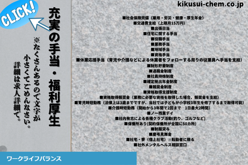 アピールポイント: \著名な建造物にも携われるチャンス/ 当社は建築業界に属し、 建築用仕上げ塗材の製造を手がけています。 建物の内外壁や天井の化粧仕上げとして使用され 快適な空間づくりに貢献しています。 生活に欠かせない製品を提供することで、 社会に広く役立つ、意義のある仕事です! 建物は形として残るため、自分の仕事の成果を 目に見える形で実感できるのが魅力の一つ! 東京支店は多くのメンバーが在籍しているため 活発なコミュニケーションを大切にしています。 チームワークを活かしながら、 やりがいのある仕事に挑戦できます◎ ··························································· 【Indeedの求人から採用された社員の声】 ◆Aさん(35歳男性) 入社:8か月目 前職:プラスチック業界ルート営業、建具業界施工管理 等 結婚を機に、転勤有無選択ができ長期的なキャリアを築ける安定感のある会社で働きたいと思い、菊水化学工業を選びました。 ・・・・・・・・・・・・・・・・・・・・・・