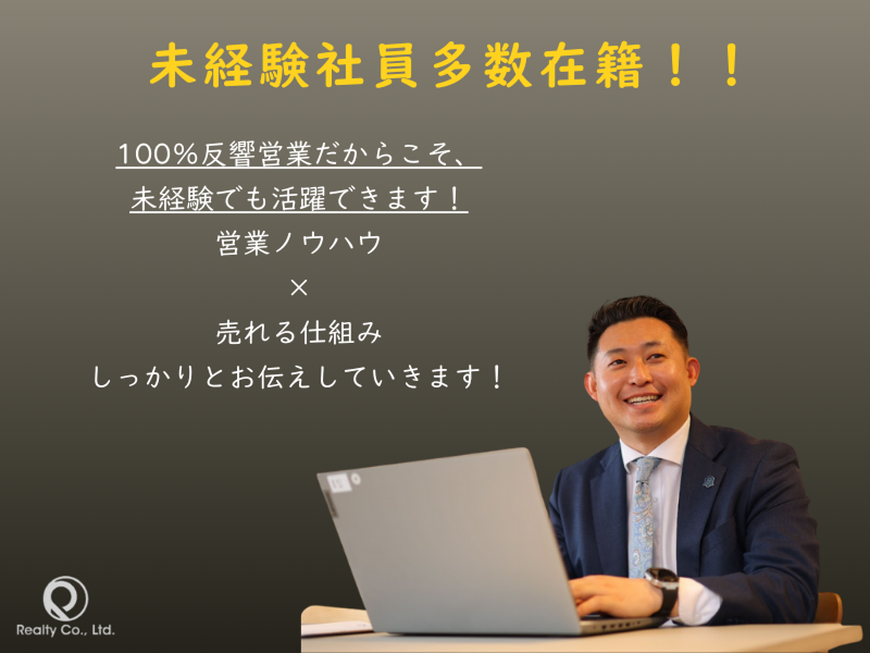 アピールポイント: * 飛び込み・テレアポなし。完全反響型の営業スタイル✨ * 実績が給与に直結。頑張りが評価される環境です! * 早期で年収UPを見込める環境を用意してます! * 動画コンテンツ40本以上、経験豊富な営業マネージャー多数在籍、物件調査やシステム研修など充実した研修・育成体制! * 未経験でも早期昇格可能✨ * 入社3年目で年収1,000万円の社員も多く在籍。 * チームワークを重視しており、安心して相談できる環境✨